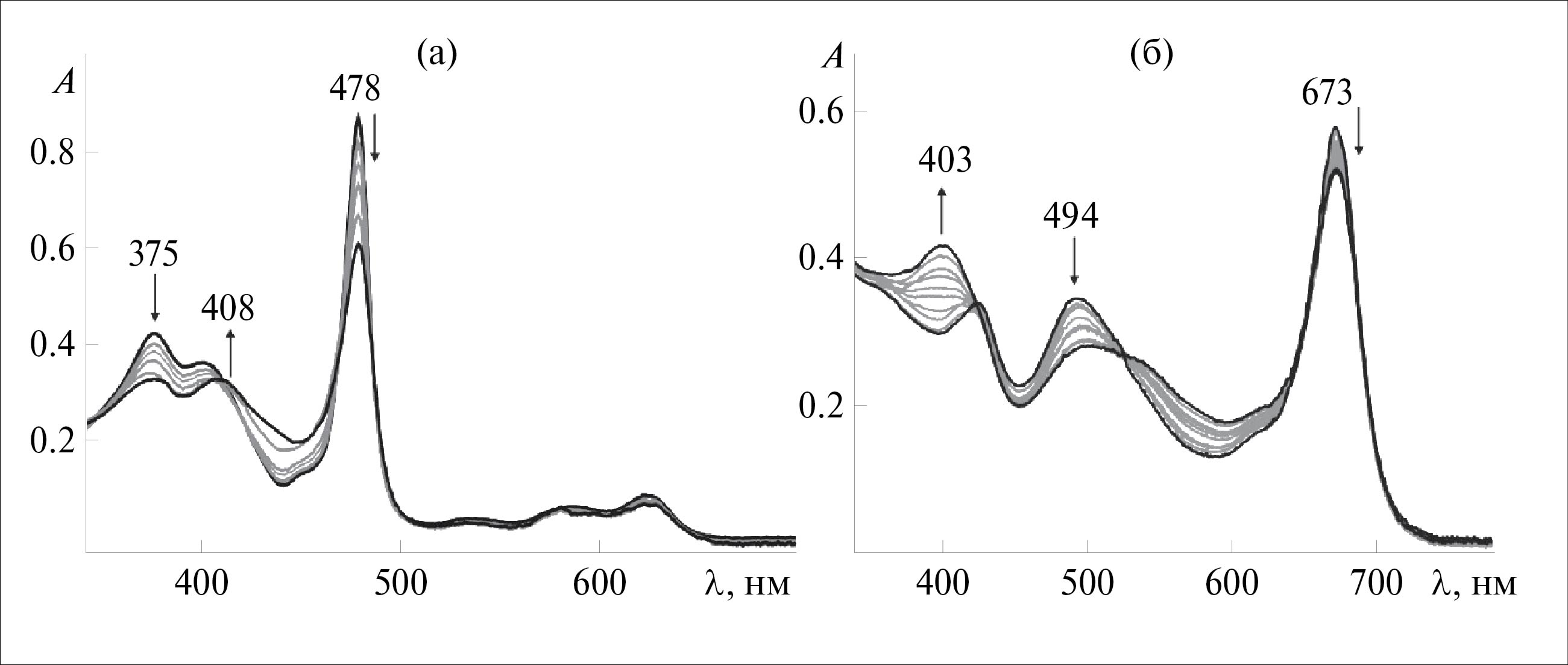 Связывание молекул Py комплексами марганца(III) во всех трех случаях сопровождается смещением и изменением интенсивности основных полос поглощения хромофора с сохранением изобестических точек. При добавлении возрастающих объемов Py к толуольному раствору (AcO)MnTtВuPP в его спектре наблюдается постепенное уменьшение интенсивности полос при 478 и 375 нм и батохромное смещение полосы при 399 до 408 нм (рис. 2а). Аналогичные спектральные изменения наблюдаются и для (AcO)MnTPP. В случае (AcO)MnTAP(4-tBuPh)8 связывание пиридина также сопровождается уменьшением интенсивности полос при 673 и 494 нм, но максимум при 421 нм (B-полоса) смещается гипсохромно до 403 нм (рис. 2б). Спектр продукта реакции для трех изученных комплексов по-прежнему принадлежит макроциклическому хромофору комплекса марганца(III). Экспериментально — разбавлением реакционных смесей по Py — установлена обратимость описанных спектральных изменений, что означает прохождение реакции до состояния равновесия.