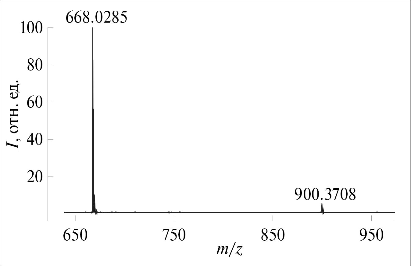 Образование координационных комплексов с Py было подтверждено данными MALDI-TOF масс-спектрометрии. Масс-спектры исследуемых MnP представлены одной интенсивной линией, соответствующей комплексному иону [M–AcO]+ без ацетатного лиганда (экспериментальная часть). Масс-спектрометрический анализ донорно-акцепторных комплексов с Py, проведенный с использованием матрицы 2,5-дигидроксибензойной кислоты (DHB), показал наличие их сигналов небольшой интенсивности наряду с сигналами свободных MnP. На рис. 4 представлен MALDI-TOF масс-спектр (AcO)(Py)MnTPP, на котором наблюдаются пики, соответствующие молекулярным ионам [M–AcO]+ (m/z 668.03) и [M–AcO + Py + DHB]+ (m/z 900.37). В случае (AcO)MnTtВuPP и (AcO)MnTAP(4-tBuPh)8 присутствуют сигналы [M–AcO]+ и [M–AcO + Py + DHB]+ со значениями m/z 892.35/1425.47 и 1124.21/1657.82 соответственно.