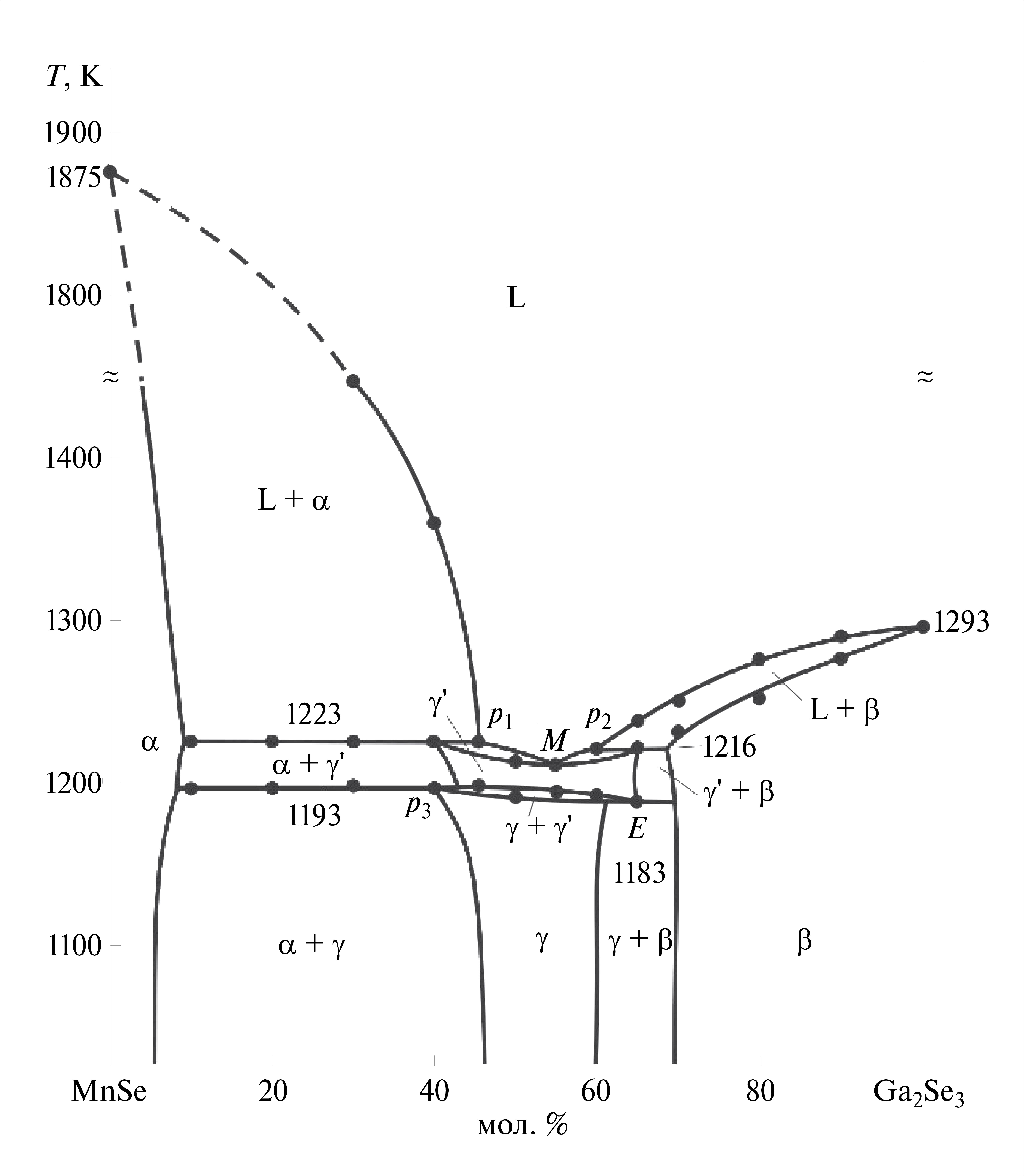 Перитектические точки имеют координаты 45 мол. % Ga2Se3 и 1223 K (р1), 60 мол. % Ga2Se3 и 1216 K (р2). Слабые, но четкие термические эффекты при температурах 1183–1193 K отнесены нами к полиморфному переходу ã′ ↔ ã [40]. При стехиометрическом составе MnGa2Se4 температура перехода составляет 1190 K. В области составов, богатых MnSe, полиморфный переход происходит по перитектоидной реакции: