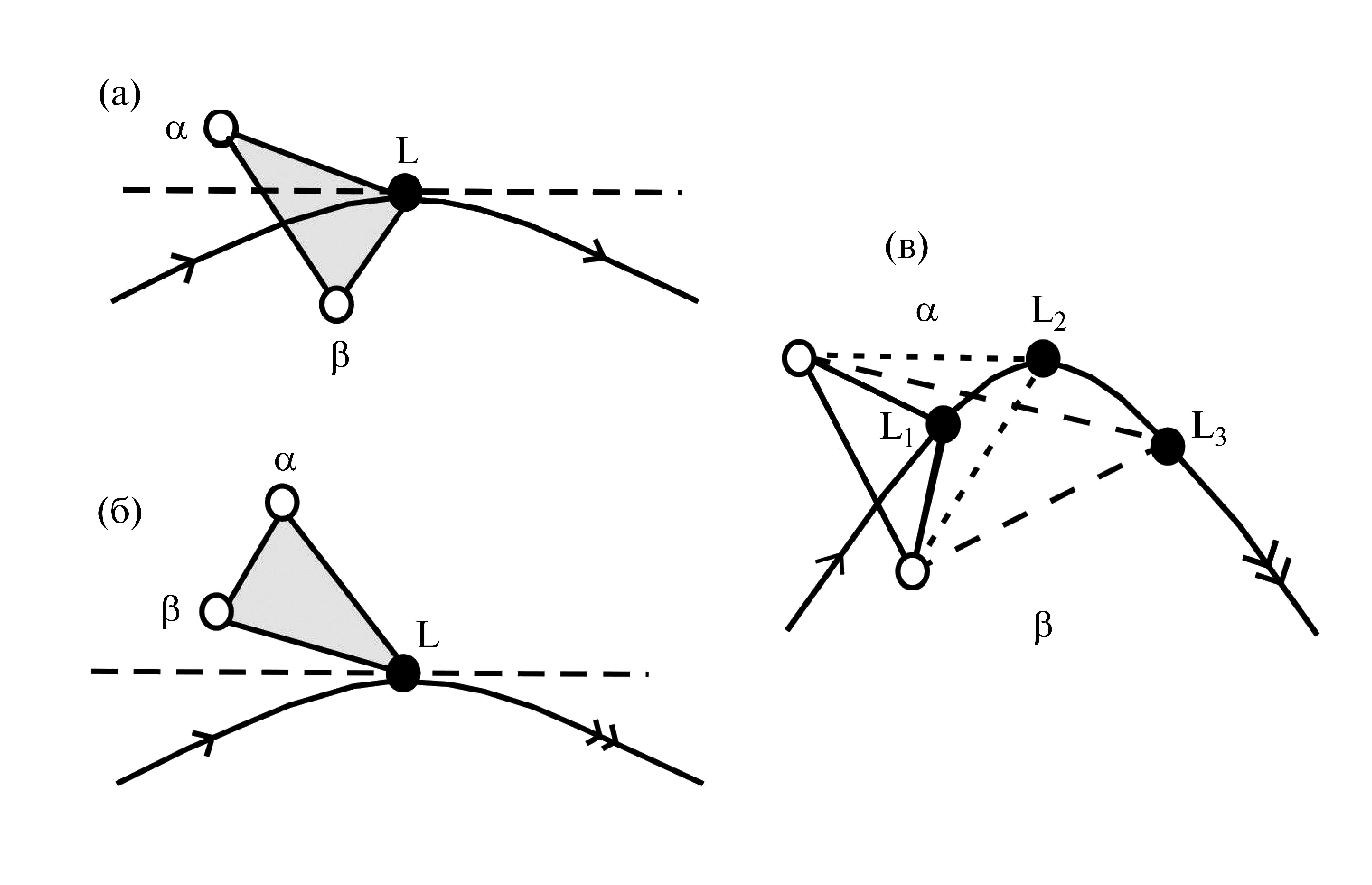 Рис. 1. Относительное расположение моновариантной линии и конодного треугольника при моновариантной эвтектической (а) и перитектической (б) реакциях, в – переход эвтектической реакции (состав расплава L1) в перитектическую (L3) через переходную точку (L2). В равновесии с расплавом находятся фазы á и â постоянного состава. Стрелки показывают направление понижения температуры. Одинарными и двойными стрелками показаны эвтектические и перитектические складки.