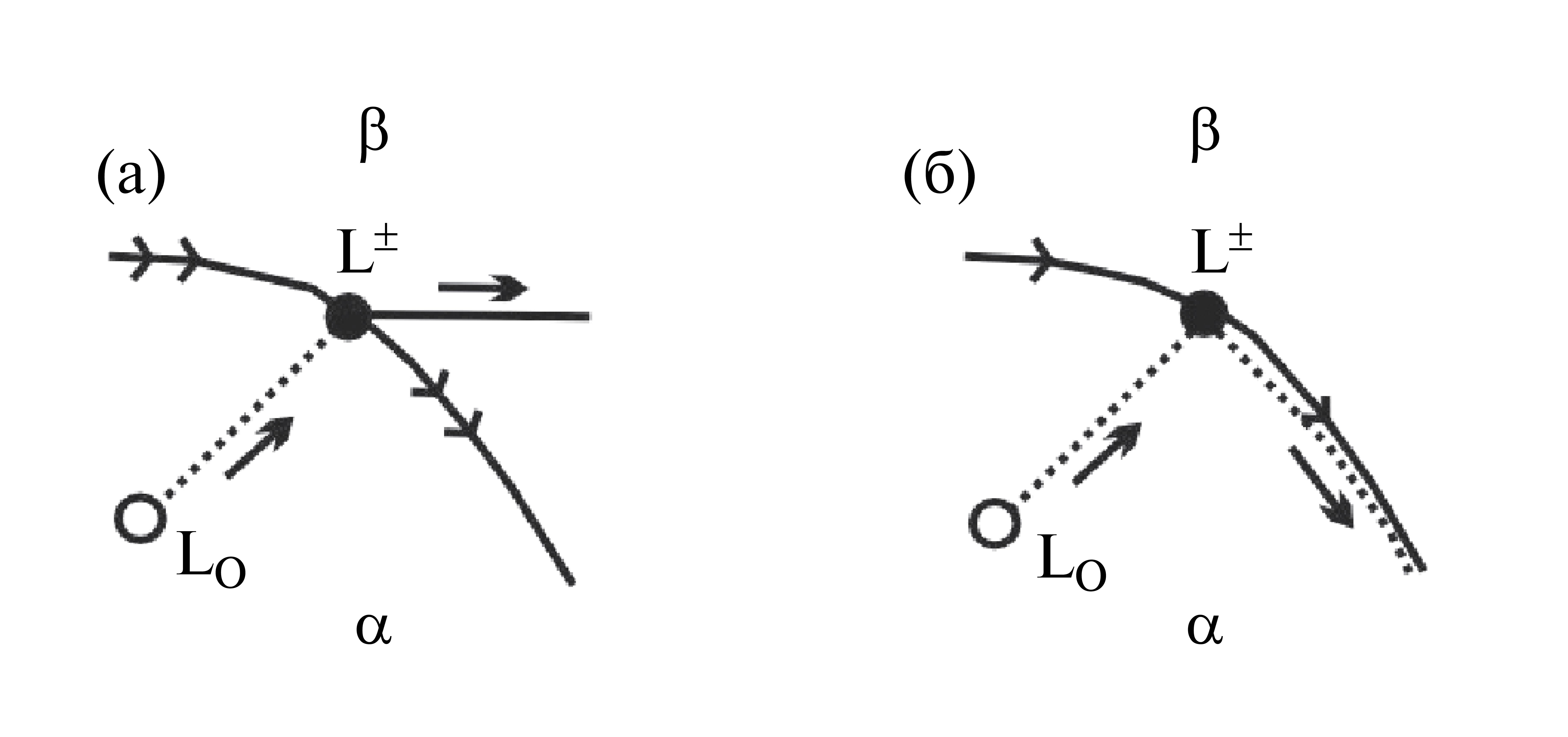 Рис. 3. Моновариантная линия с переходной точкой L на линии между областями первичной кристаллизации фаз á и â и траектории состава расплава при направленной кристаллизации; а — перитектическая складка переходит в эвтектическую, б — эвтектическая складка переходит в перитектическую.
