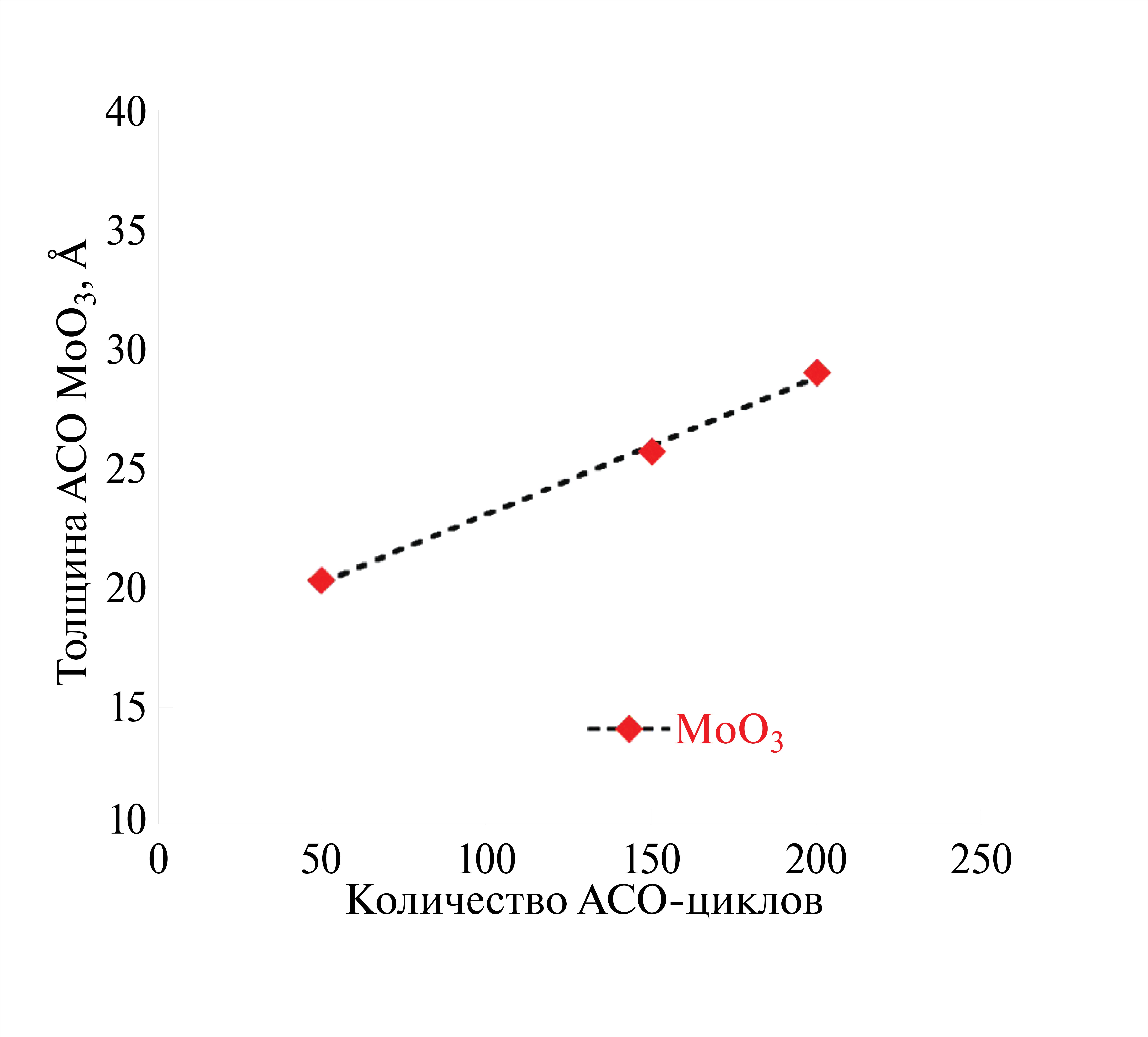 На графике приведены значения толщины пленок, полученных с использованием 50, 150 и 200 циклов АСО. Как видно из рисунка, наблюдается увеличение толщины с увеличением количества циклов АСО, постоянная роста для пленки, полученной с использованием 200 циклов АСО, составила 0.15 Å/цикл. Для пленки, полученной в результате процесса с использованием 150 циклов АСО, постоянная роста составила 0.17 Å/цикл, а при количестве циклов АСО, равном 50, значение постоянной роста составило 0.4 Å/цикл. Таким образом, для данного процесса наблюдается тенденция уменьшения постоянной роста с увеличением количества циклов АСО и установления на значении ~0.15 Å/цикл, это объясняется тем, что на этапе нуклеации на затравочном слое Al2O3 постоянная роста выше, а по мере образования монослоя MoO3 на поверхности при установившемся режиме формирования пленки значение постоянной роста стабилизируется на одном уровне. Такой тип роста АСО-пленок ранее характеризовался как поверхностно-стимулированный [29].