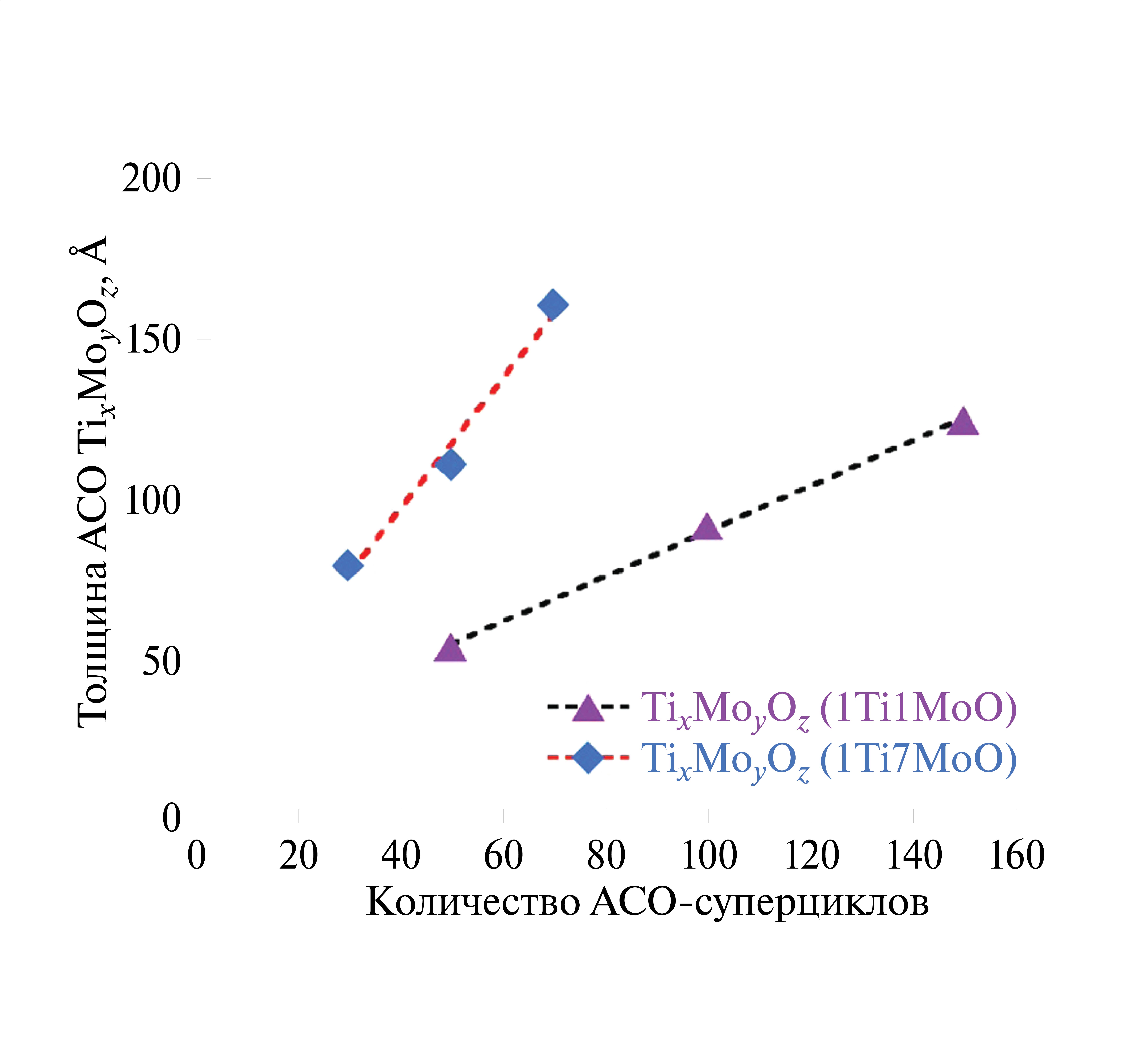 Наблюдается увеличение толщины с увеличением количества суперциклов АСО. Данные постоянной роста из СЭ составили 0.83 и 2.3 Å/суперцикл для 1Ti1MoО (150 суперциклов) и 1Ti7MoО (70 суперциклов) соответственно. Поскольку интерполяционные линии не проходят через начало координат, как и в случае АСО МоО3 на Al2O3, можно предположить поверхностно-стимулированный механизм роста [29].