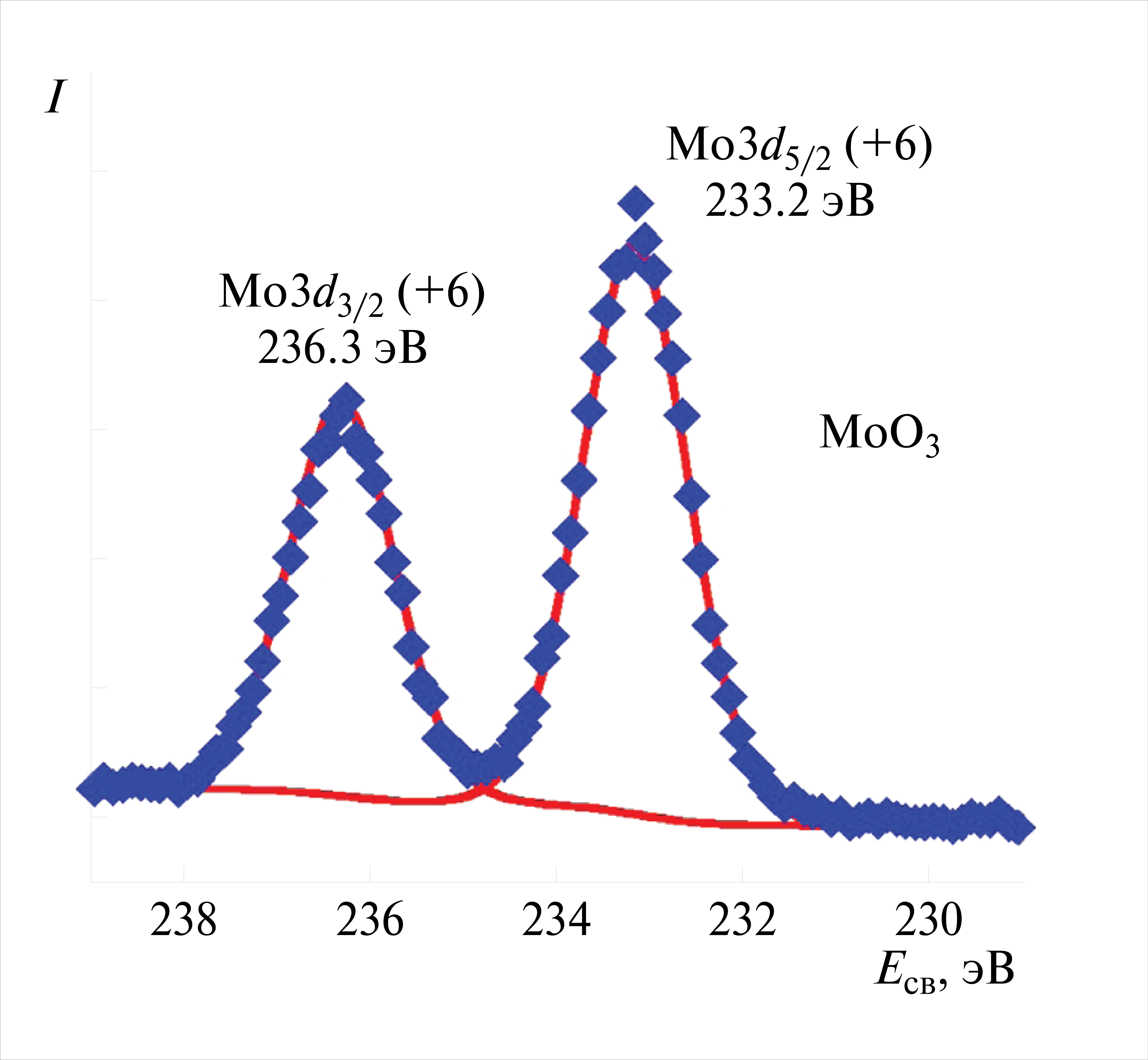 Для детального определения химического состояния молибдена в полученных пленках было выполнено РФЭС-сканирование высокого разрешения в области спектральных линий 3d-уровня Мо. На рис. 3 приведен спектр РФЭС для АСО-пленки МоО3 (на Al2O3), полученной при температуре 150°С с использованием MoOCl4 и Н2О. В спектре остовных уровней Mo 3d преобладает спин-орбитальный дублет Mo3d3/2–Mo3d5/2. Позиция пика Mo3d5/2 с энергией связи 233.2 эВ находится в пределах литературных значений для МоО3, где Mo имеет степень окисления +6 [38]. Позиция пика Mo3d3/2 с энергией связи 236.3 эВ [39] также находится в пределах литературных значений для Mo6+, что соответствует степени окисления молибдена в прекурсоре (MoOCl4).