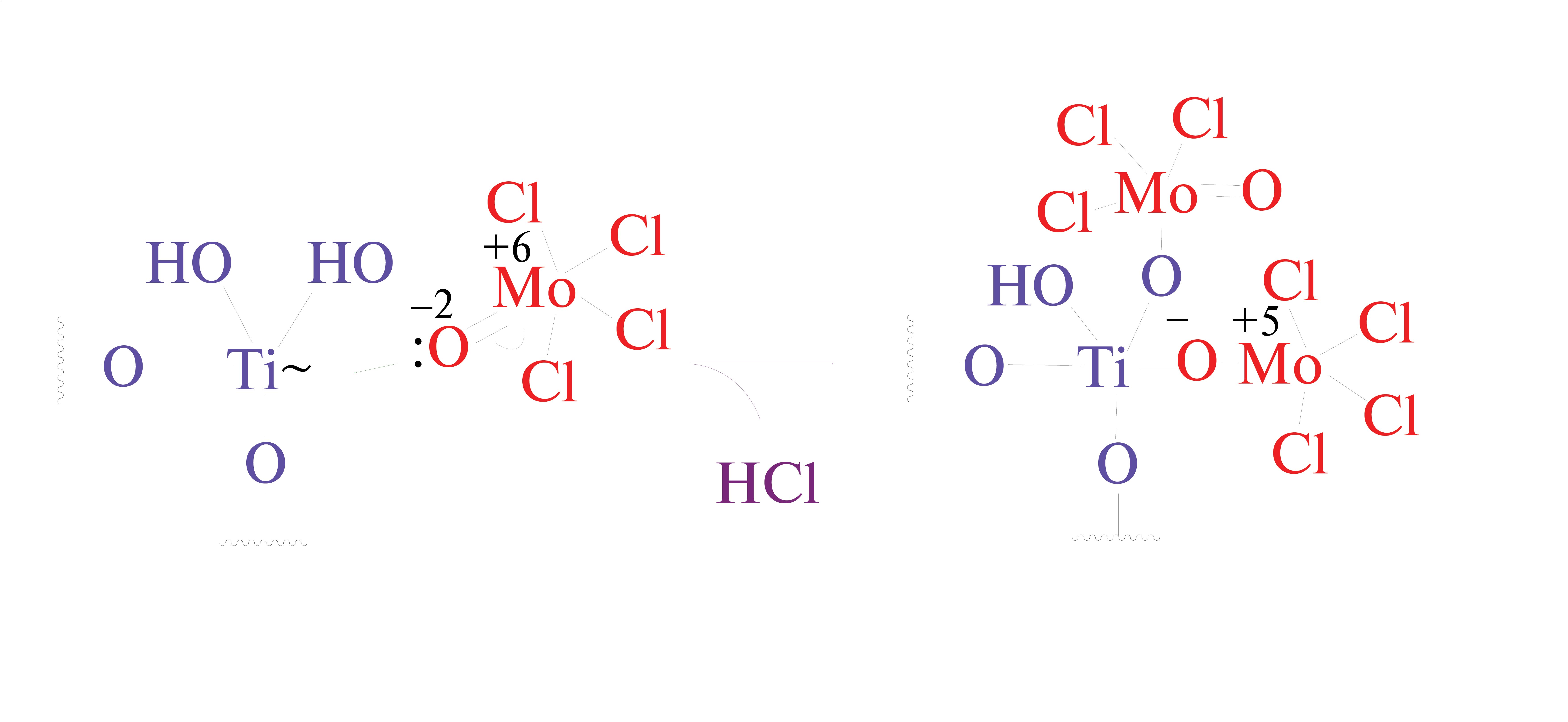 Отклонение механизма поверхностных реакций от идеализированной схемы, представленной в работе [14], сопровождаемое восстановлением молибдена, может быть связано с формированием поверхностных комплексов (–O)хTi ← :O=MoCl4 (рис. 5), вследствие образования ковалентной связи между неподеленной электронной парой атома кислорода в молекуле MoOCl4 с вакантными d-орбиталями атомов титана по донорно-акцепторному механизму. При образовании подобной связи при АСО 1Ti1MoO есть вероятность переноса электронной плотности с атома кислорода на атом молибдена и гетеролитического разрыва связи в Mo=O-группе, что может привести к восстановлению Mo с +6 до +5. Подобные эффекты в АСО ранее рассмотрены на примере P=O: → Ti и P=O: → V поверхностных донорно-акцепторных комплексов и подробно описаны в работе [56].