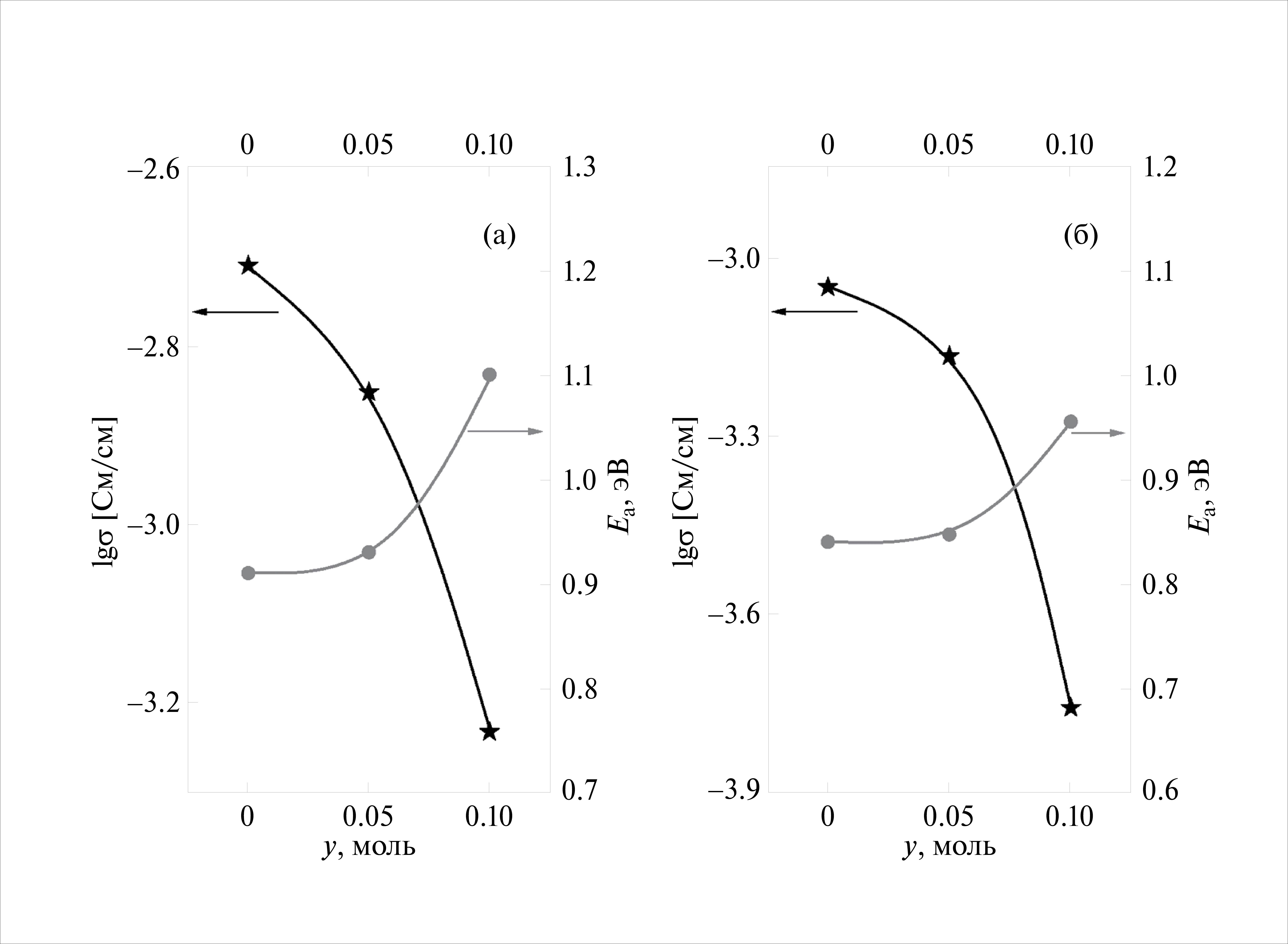 Рис. 7. Концентрационные зависимости общей (а) и кислород-ионной (б) проводимости и их энергий активации при температуре 700°С для твердых растворов La0.9Sr0.1In1–yMgyO2.95–0.5y.