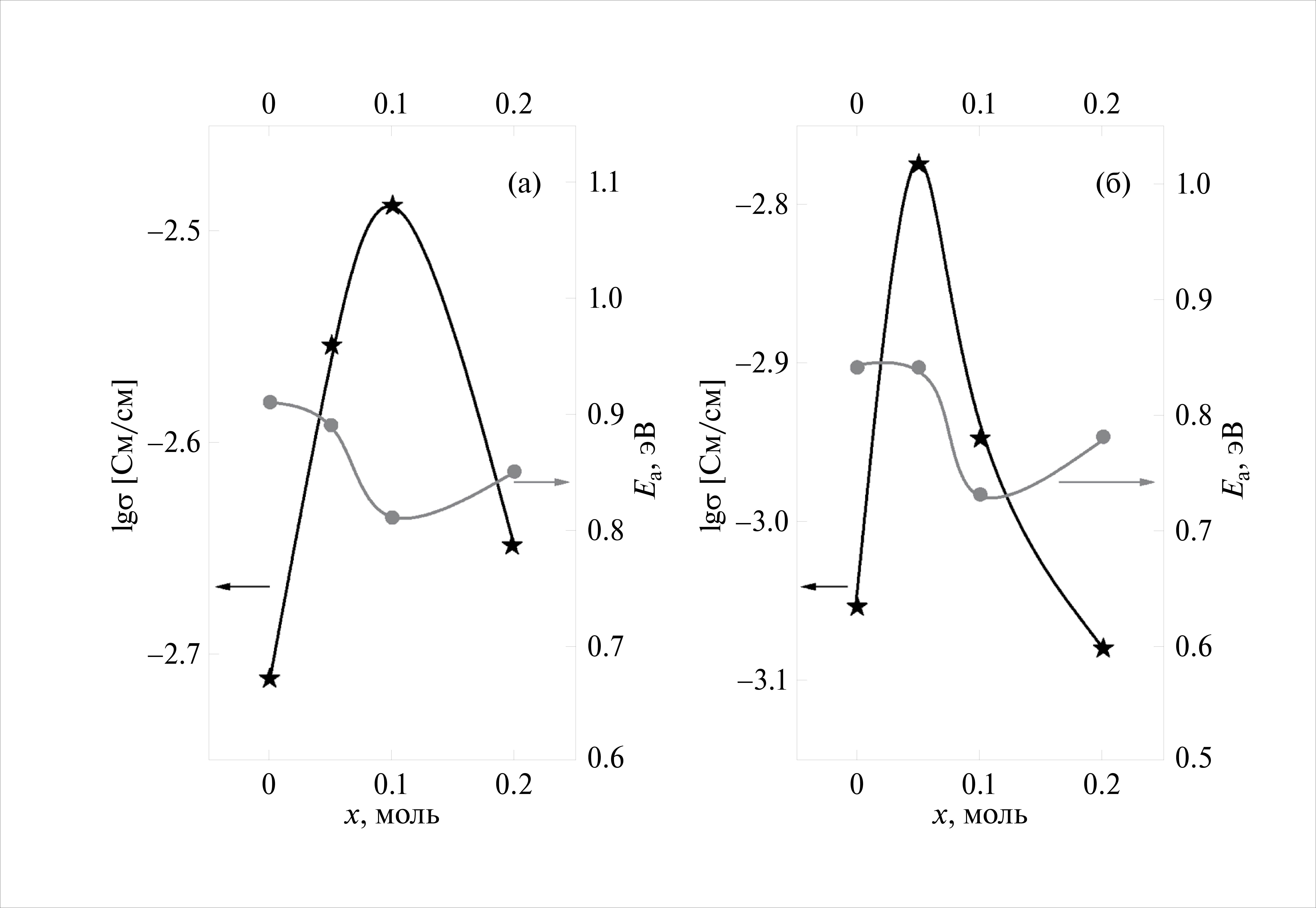 Для более детального анализа влияния содопирования на транспортные свойства были построены концентрационные зависимости проводимости (рис. 7 и 8).