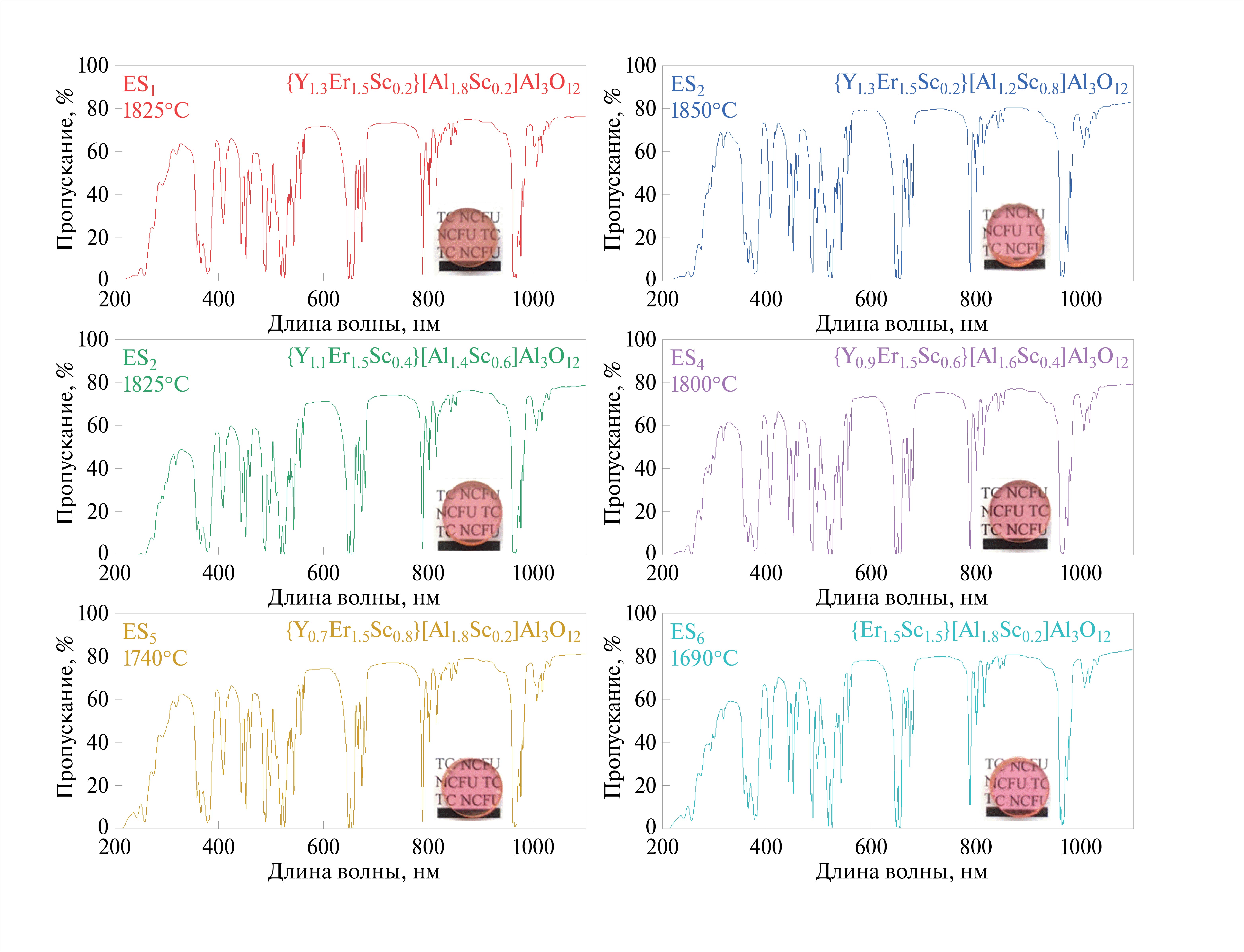 Критерием отбора образцов керамики для изучения влияния концентрации и положения катионов скандия в позициях решетки граната на ее теплофизические свойства были оптические характеристики указанных образцов. Данный критерий выбора образцов обусловлен тем, что оптические характеристики керамики свидетельствуют о ее качестве, т.е. об отсутствии или наличии пористости и других дефектов, являющихся центрами рассеяния. Кроме того, присутствие подобных дефектов будет вносить искажения в теплофизические характеристики. Таким образом, для исследования были выбраны образцы, полученные при различных температурах вакуумного спекания (ES1 — 1825°C, ES2 — 1850°C, ES3 — 1825°C, ES4 — 1800°C, ES5 — 1740°C, ES6 — 1690°C) и имеющие максимальную величину оптической прозрачности. Оптические характеристики выбранных образцов представлены на рис. 4.