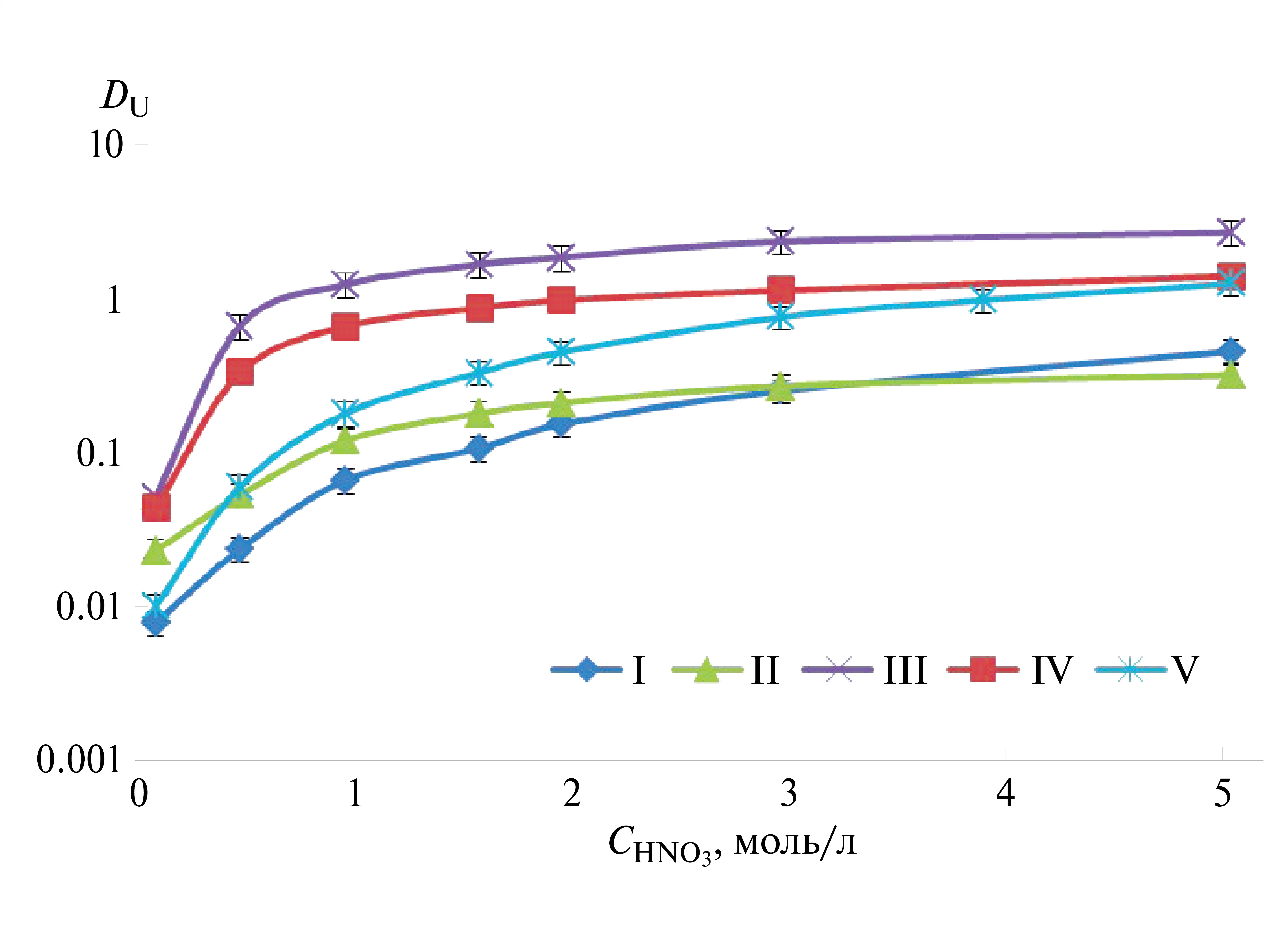 Рис. 1. Зависимость коэффициентов распределения урана(VI) от концентрации азотной кислоты при экстракции 0.01 моль/л растворами соединений I–V в хлороформе при содержании 0.025 ммоль/л урана(VI) в исходном растворе.