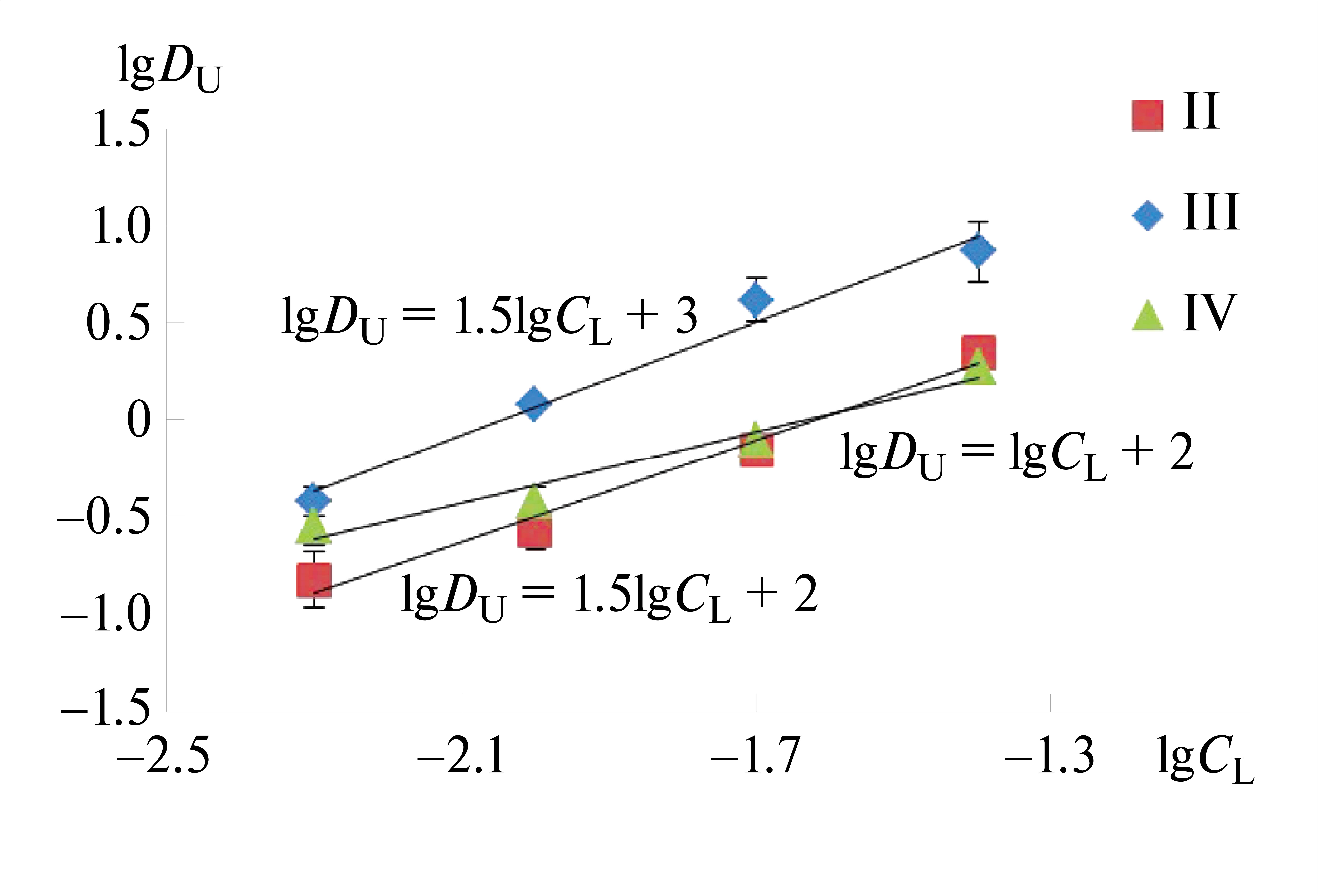 Методом сдвига экстракционного равновесия при варьировании концентрации лиганда были установлены составы комплексных соединений лигандов II–IV с катионом уранила. Так, для соединений II и III характерно образования как моно-, так и бис-лигандных комплексов (наблюдаемый угловой коэффициент билогарифмической зависимости на рис. 2 близок к 1.5), в то время как в случае соединения IV в смеси присутствует преимущественно монолигандный комплекс и, возможно, гидратированная форма (см. уравнения (1)–(3)) [30].