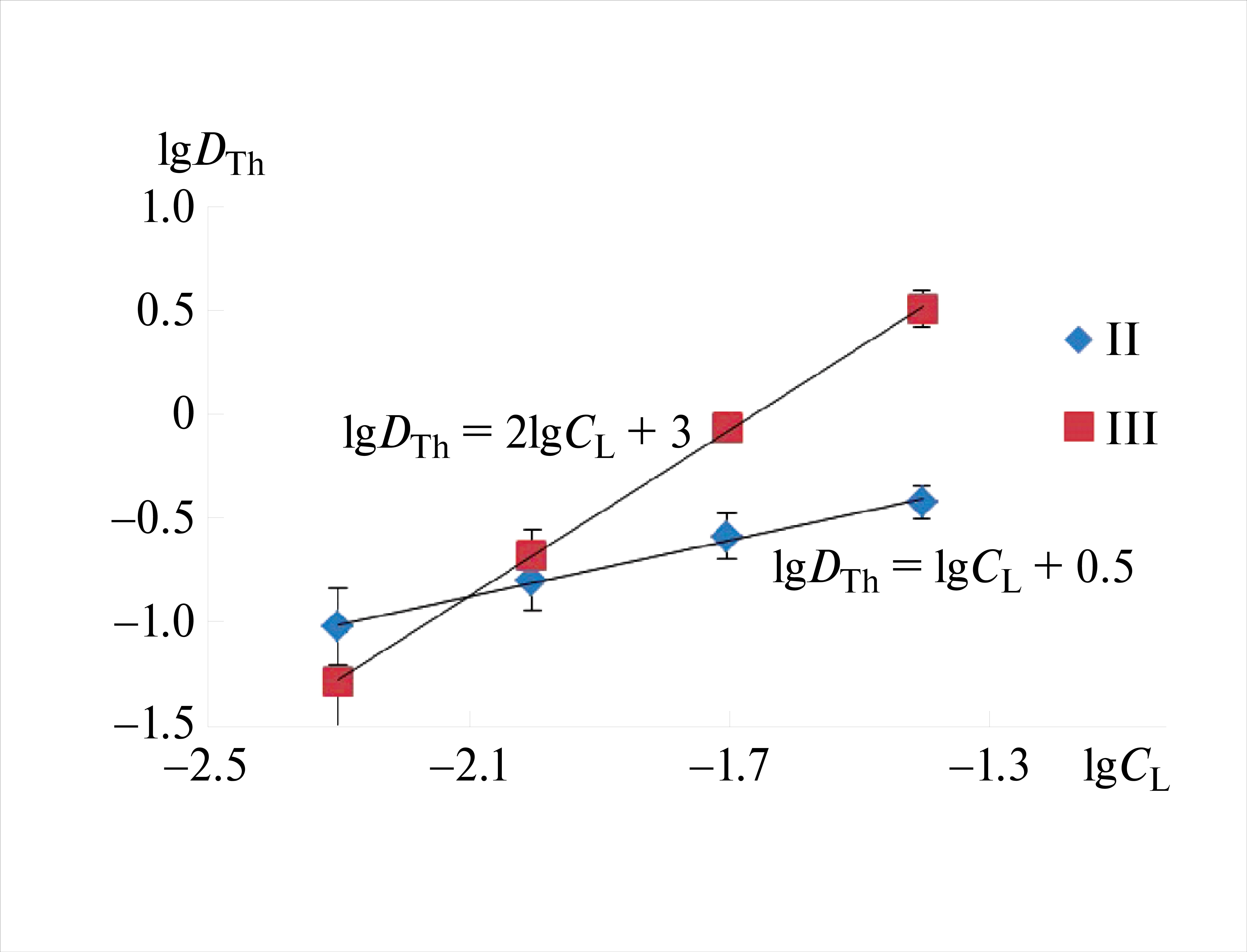 Как и в случае с U(VI), составы образующихся при экстракции Th(IV) комплексных соединений для лигандов II и III были установлены методом сдвига равновесия при варьировании концентрации лиганда (рис. 4). Соединение II образует преимущественно монолигандный комплекс, в то время как соединение III – бис-лигандный (см. уравнения (4), (5)).