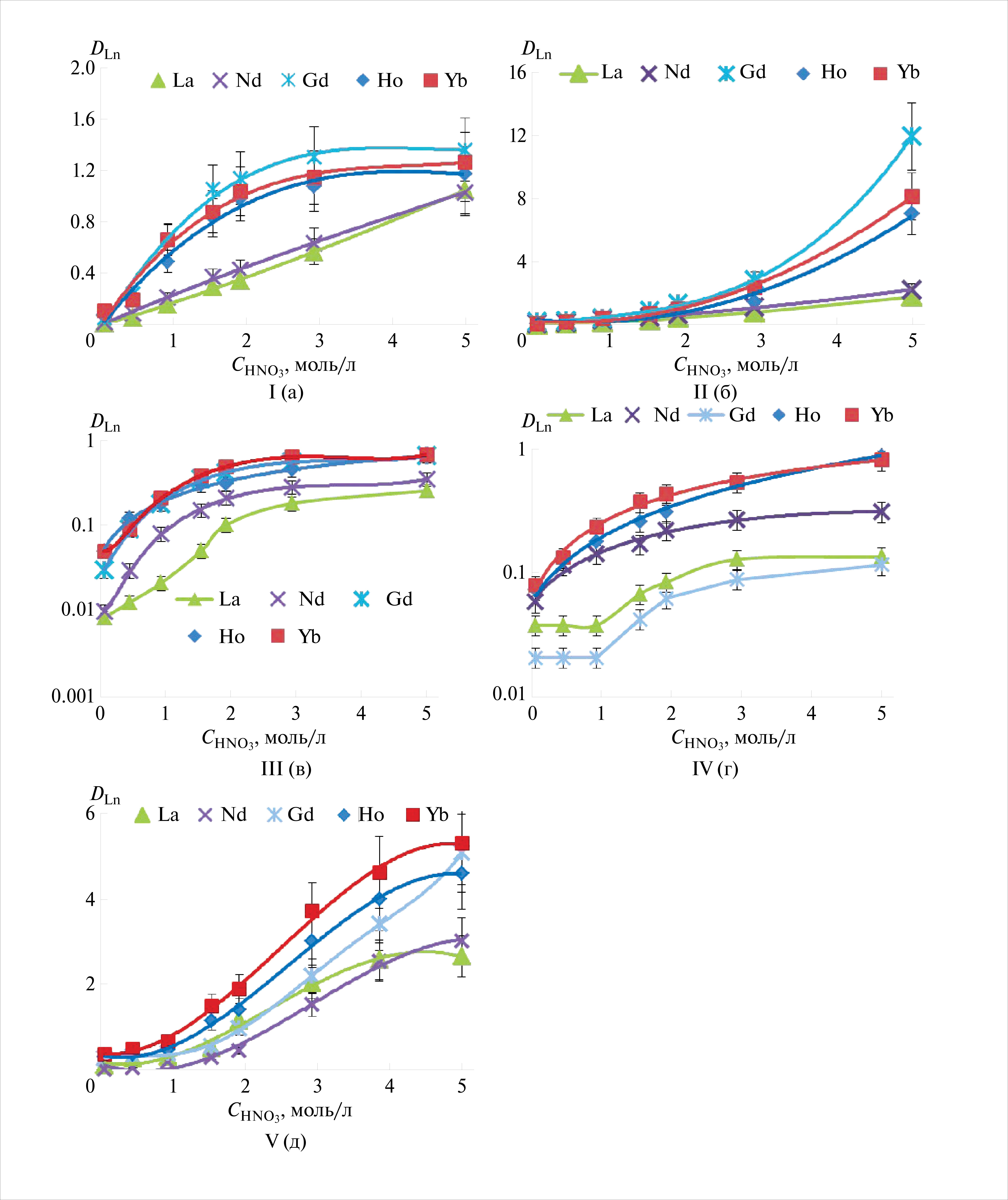 Для изучения экстракции лантанидов были использованы те же методики, что и для исследования экстракции урана и тория. Зависимость коэффициентов распределения DLn от концентрации азотной кислоты, представленная на рис. 5, имеет сходный с актинидами характер в части возрастания и последующего выхода на плато коэффициентов распределения экстрагируемых металлов с ростом концентрации азотной кислоты только для лиганда III и в меньшей степени для лиганда IV (рис. 5в и 5г). Для лигандов I, II и V характер зависимости отличается от вышеописанного (рис. 5а, 5б и 5д соответственно), в частности, в случае двух последних соединений при экстракции ими гадолиния(III) наблюдается резкий (особенно заметный у КЭФО II) рост величины DLn с повышением концентрации HNO3, в результате чего степень извлечения этого лантанида из 5 моль/л азотной кислоты в одну стадию достигает 92%. Экстракция лантанидов иттриевой подгруппы в целом протекает более эффективно, чем цериевой, для всех исследованных лигандов. Как известно, эффективность экстракции лантанидов нейтральными фосфорорганическими соединениями следует известному правилу изменения прочности координационных комплексов лантанидов (“гадолиниевый угол”) [32]: (La > Nd) < < (Ho < Yb), хотя для исследованных КЭФО селективность в отношении пар тяжелых и легких лантанидов невелика, а заметную селективность проявляет только лиганд II. Так, коэффициенты разделения в парах Ho(III)/Nd(III) и Yb(III)/La(III) равны соответственно 3.2 и 4.6 при концентрации азотной кислоты 5 моль/л, что позволяет рассматривать данный лиганд как перспективный экстрагент для группового разделения лантанидов.