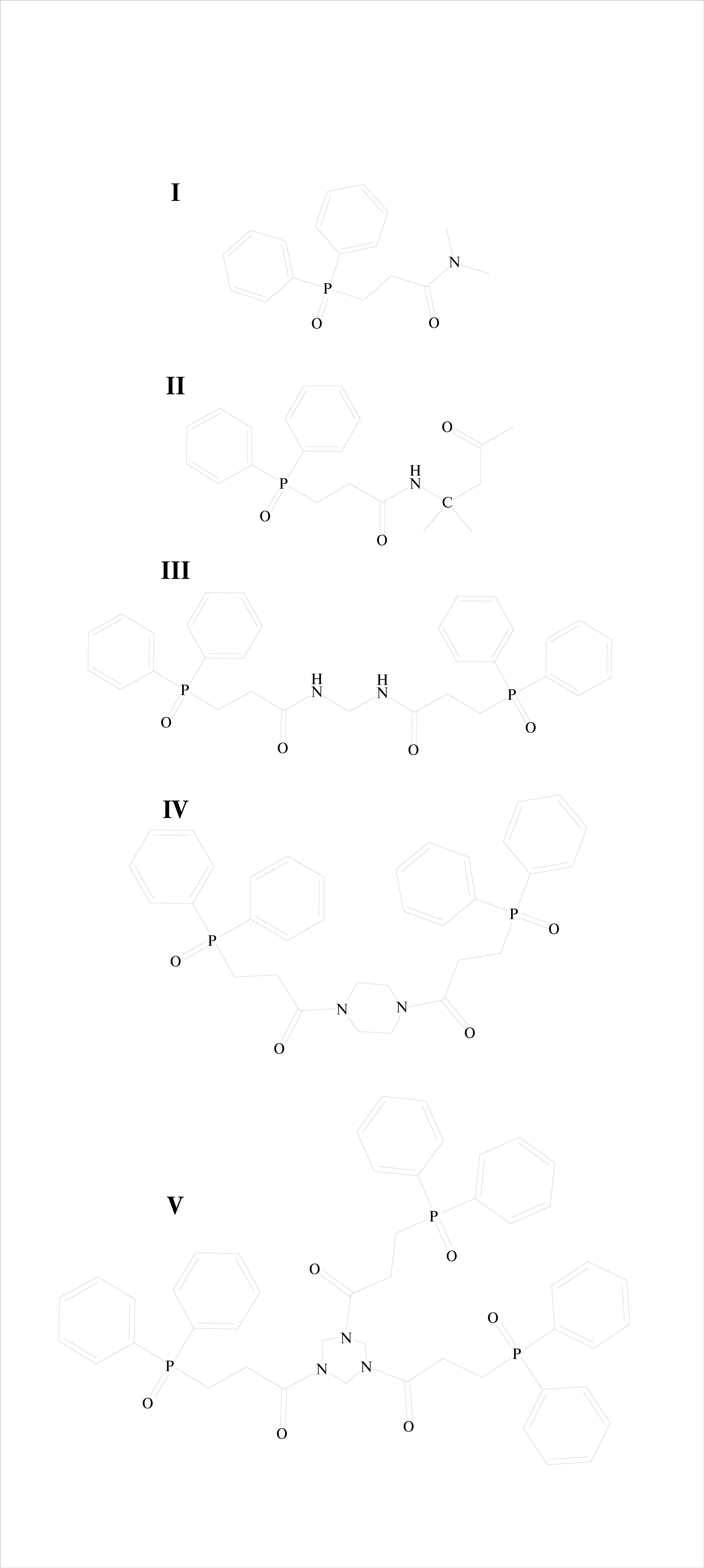 В настоящей работе с целью создания новых высокоэффективных и селективных экстрагентов для f-элементов осуществлен синтез ряда N-моно- и N,N-дизамещенных Р,Р-дифенилфосфорилсодержащих КЭФО (I–V), а также исследовано влияние структуры этих соединений на их экстракционные свойства по отношению к лантанидам и актинидам. При этом рассмотрено влияние на их экстракционную способность введения (по аналогии с КМФО) в молекулу лиганда дополнительных центров координации, количества лигандирующих Ph2P(O)CH2CH2C(O)-фрагментов, а также природы линкеров, разделяющих эти фрагменты.