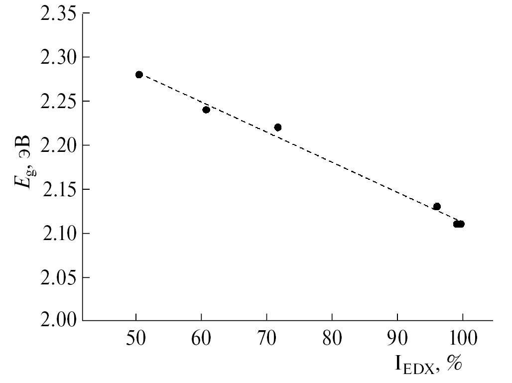 Оптические свойства полученных твердых растворов определяются типом кристаллической структуры и содержанием иода в гибридных галовисмутатах. Для [HPy]3Bi2X9, имеющего изолированные анионы, величина Eg практически линейно (рис. 3) зависит от содержания иода в анионе, снижаясь от 2.28 эВ для [HPy]3Bi2Br4.44I4.56 до 2.11 эВ для [HPy]3Bi2Br0.04I8.96. Для соединений состава [HPy]BiX4 характерно изменение Eg от 2.79 эВ для [HPy]BiBr4 до 1.98 эВ для [HPy]BiBr0.02I3.98.