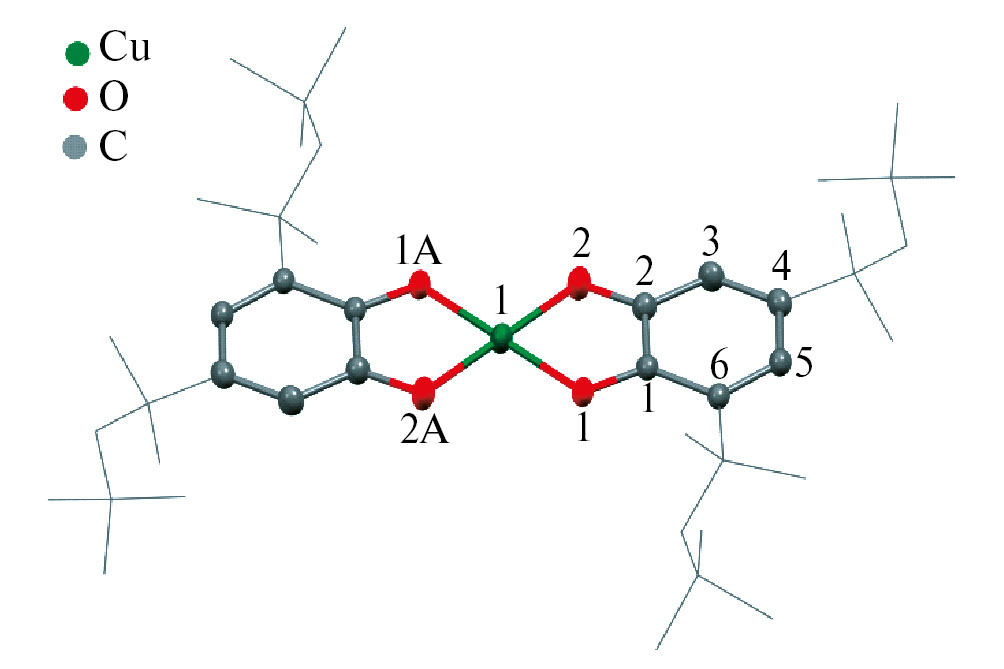 Атом Cu(II) в I имеет плоскоквадратное окружение, образованное четырьмя атомами кислорода двух о-семихиноновых лигандов. Угол между плоскостями двух металлоциклов составляет 180.0°. Длины связей O(1)–С(1) и O(2)–С(2) (1.289(2) и 1.281(2) Å соответственно) позволяют однозначно характеризовать структуру хинонового лиганда как о-семихиноновую [63]. Длины связей Cu(1)–O(2) и Cu(1)–O(1) (1.900(2) и 1.935(2) Å соответственно) также отвечают значениям, характерным для семихиноновых комплексов меди(II) [60, 62].