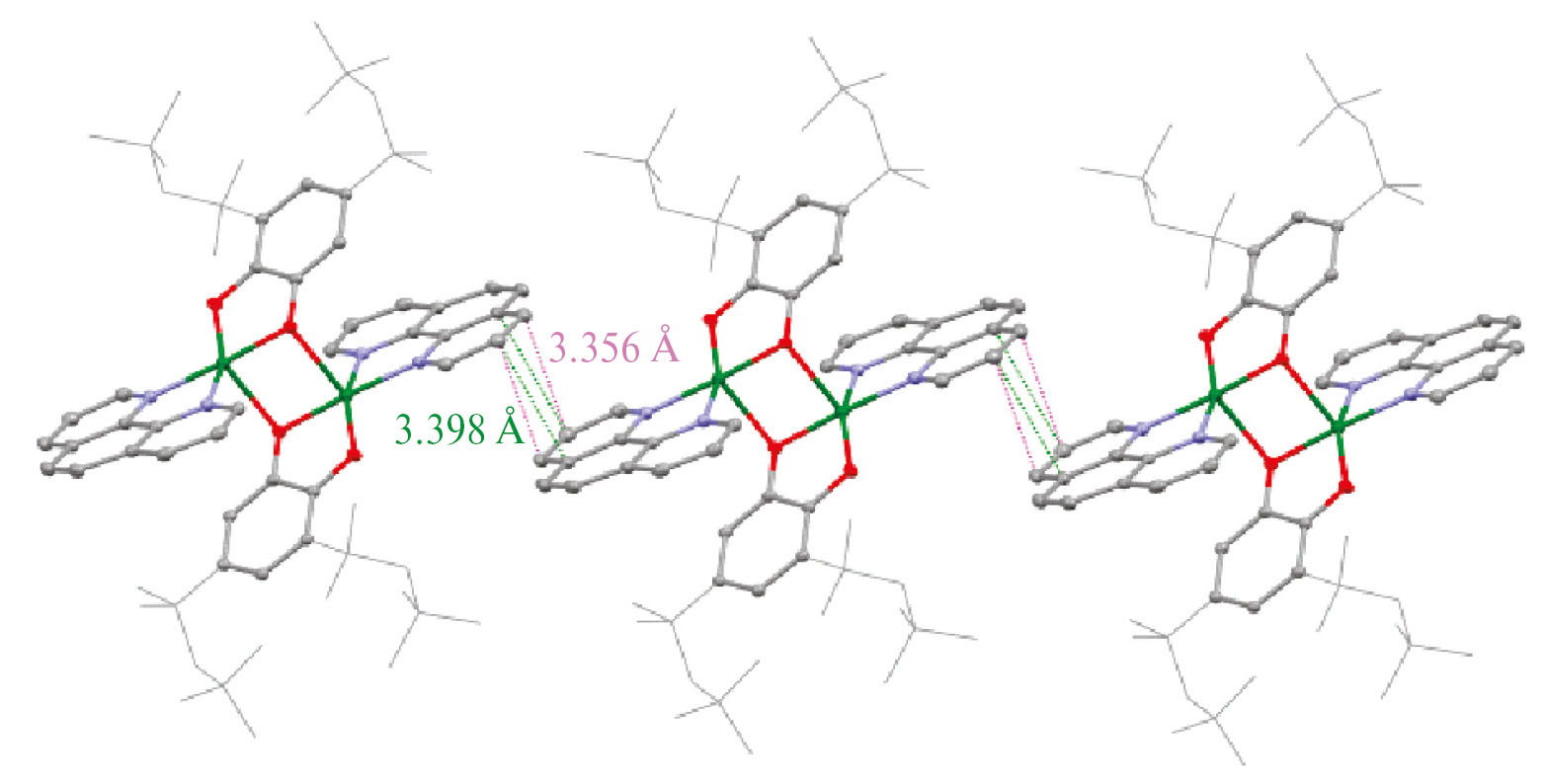 Производные II–IV плохо растворимы в большинстве доступных органических растворителей, что обусловлено наличием большого числа коротких межмолекулярных контактов в кристаллических образцах. Так, по данным рентгеноструктурного анализа, в производном II наблюдаются контакты (3.356 и 3.398 Å), представляющие собой π–π-взаимодействия между лигандами фенантролинового типа соседних димерных молекул, формируя при этом бесконечные одномерные цепи в кристалле (рис. 3).