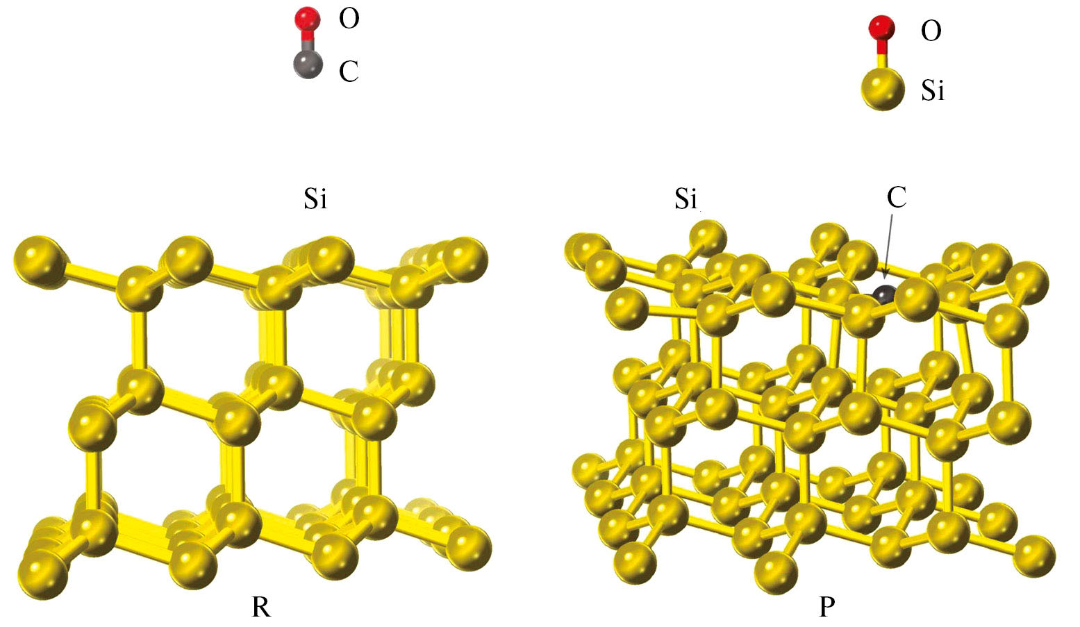Для описания состояния исходных реагентов, т.е. поверхности Si(111) и молекулы CO, в середину слоя вакуума исследуемой системы помещали молекулу CO, центр тяжести которой оставался неподвижным, после чего геометрию системы оптимизировали, т.е. находили минимум полной энергии системы в зависимости от координат всех атомов при постоянстве размеров самой суперъячейки. Подчеркнем, что искусственно поверхность Si(111) не подвергали реконструкции, так как при указанных условиях в экспериментах реконструкцию поверхности никогда не наблюдали ни для Si(111), ни для SiC-3C(111). Процедуру оптимизации геометрии выполняли методом функционала плотности (Density Functional Theory (DFT)) в обобщенном градиентном приближении (Generalized Gradient Approximation (GGA)) с использованием псевдопотенциалов, использующих метод проекционных присоединенных волн (PAW) [15]. Для вычисления обменно-корреляционной энергии использовали функционал PBE [16]. Расчеты проводили в программном пакете Medea-Vasp [16] в базисе плоских волн и в спин-поляризованном приближении [15]. Энергия обрезания плоских волн во всех расчетах составляла 400 эВ. Для интегрирования по зоне Бриллюэна использовали сетку k-точек, генерируемую по схеме Монхорста–Пака, расстояние между которыми было ~0.24–1, что соответствовало разбиению 2 × 2 × 1 [15]. Функционал PBE был выбран потому, что он адекватно учитывает обменно-корреляционные эффекты, очень хорошо оптимизирует геометрию и лучше всех рассчитывает магнитные моменты в кристаллах, которые в данном случае очень важны. Аналогично описывали продукты реакции, т.е. поверхность Si(111) с одним атомом Si, замещенным на атом C, и молекулу SiO.