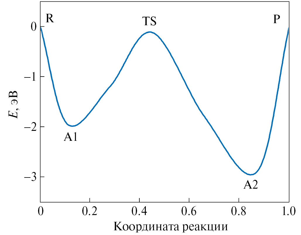 Перейдем теперь к описанию реакции замещения. Сближение молекулы CO с поверхностью Si(111) приводит к химическому взаимодействию между ними. В результате молекула CO поглощается кристаллом Si, после чего продукт реакции SiO выталкивается из кристалла. В настоящей работе рассмотрено взаимодействие CO лишь с первым атомом Si, наименее связанным с поверхностью. Для вычисления пути реакции и ее энергетического профиля был применен метод упругих лент (Nudged Elastic Band (NEB)) [21]. Данный метод позволяет определить так называемый путь с минимальным перепадом энергии (Minimal Energy Pathway (MEP)) [21]. Это такой путь реакции, при котором любое локальное изменение пути приводит к увеличению энергии системы в окрестности данной точки пути. Иными словами, это путь наискорейшего спуска из исходной конфигурации реагентов в конечную конфигурацию продуктов реакции, т.е. наиболее вероятный путь реакции. В теории фазовых переходов первого рода координата вдоль такого пути из исходной фазы в конечную является параметром порядка данного фазового перехода. Соответственно, сечение поверхности потенциальной энергии вдоль пути реакции является энергетическим профилем реакции. В физике фазовых переходов первого рода это соответствует зависимости энергии системы от параметра порядка [22].