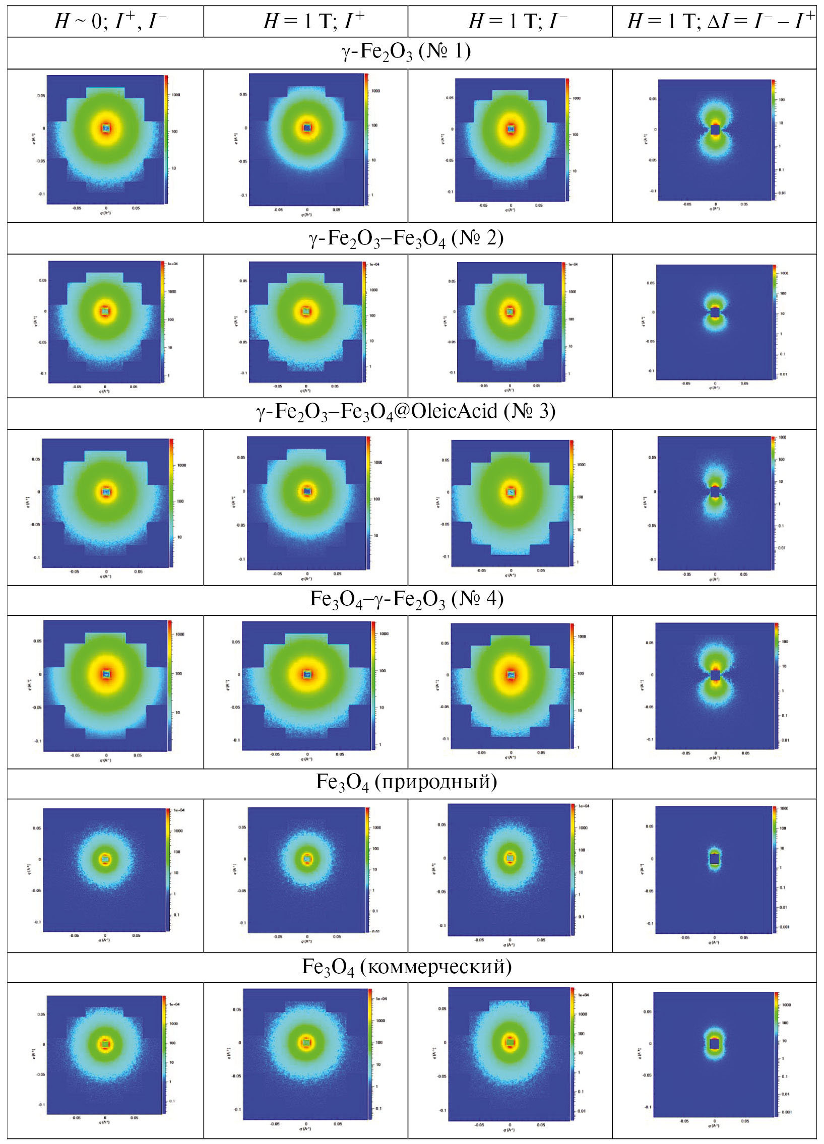Рис. 1. Экспериментальные двумерные интенсивности рассеяния в разных поляризационных состояниях падающих нейтронов и разность IMN(q, α) = I –(q, α) – I+(q, α), полученные для нанопорошков оксидов железа при измерениях во внешнем магнитном поле Н = 1 Т. Квадрат в центре детектора – след от поглотителя пучка (beamstop).