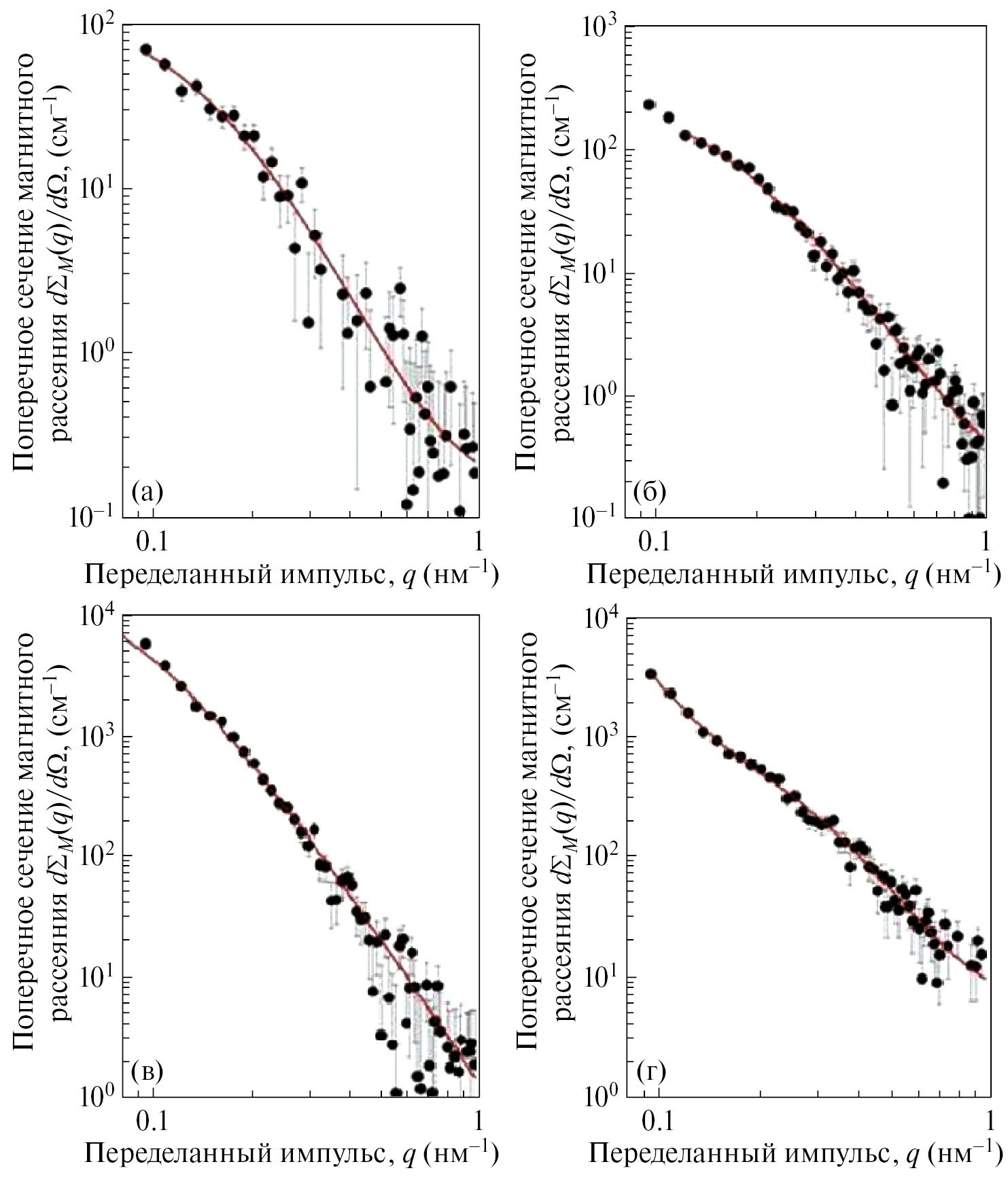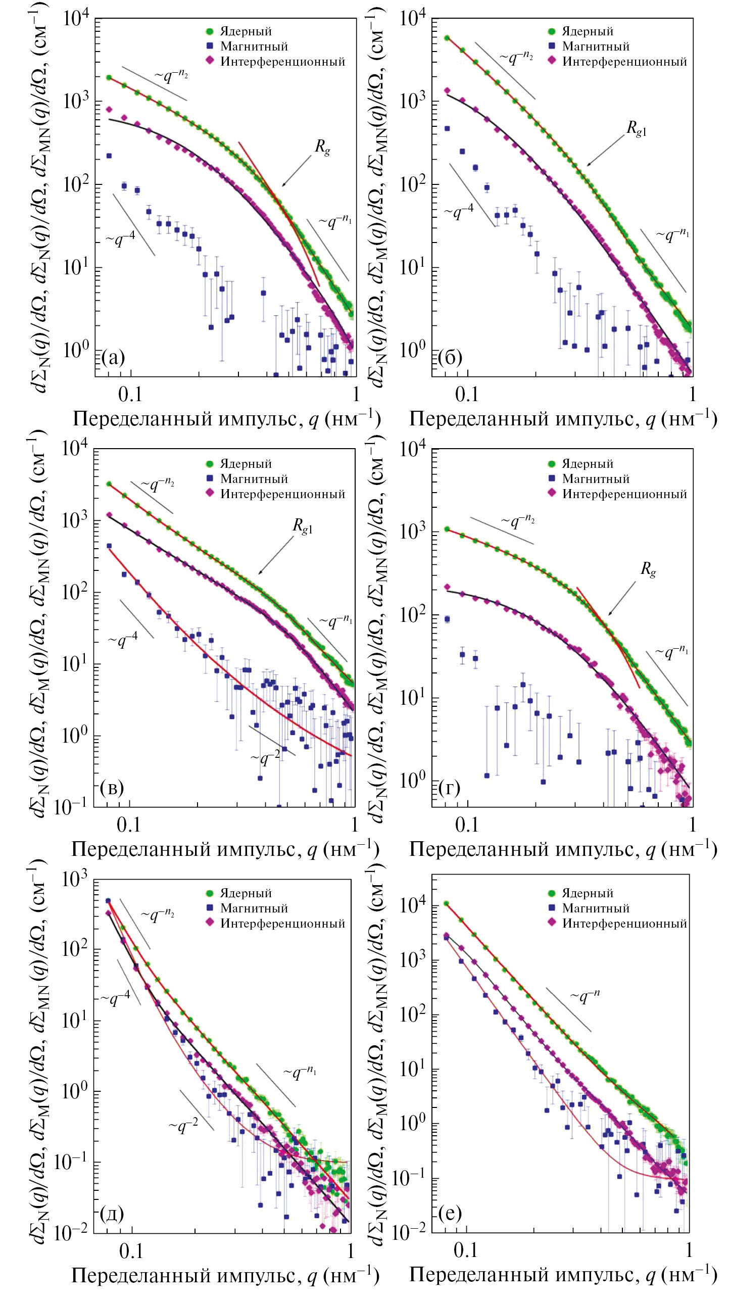 Таким образом, при анализе кривых dΣN(q)/dΩ для образцов γ-Fe2O3 (С/О 1) (рис. 2а) и Fe3O4–γ-Fe2O3 (С/О 4) (рис. 2г) была использована обобщенная эмпирическая модель Гинье–Порода [54]: