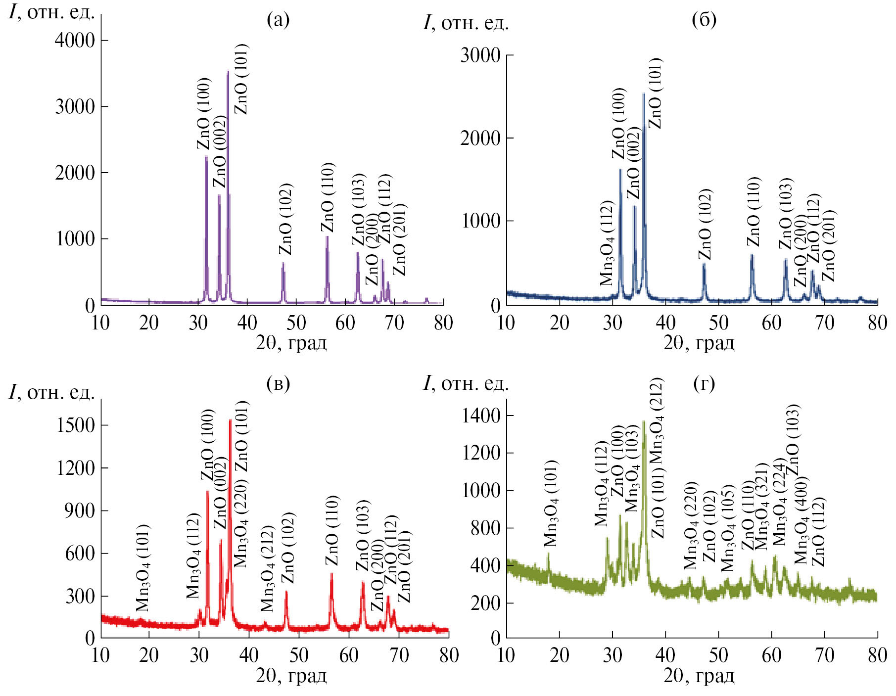 При вхождении ионов Mn2+ в структуру ZnO в [35] на рентгенограммах наблюдался сдвиг пиков этих кристаллов в сторону меньших значений 2θ. Это связано с расширением элементарной ячейки ZnO при замещении ионов Zn2+ (ионный радиус 0.74 Å) на бо`льшие по размеру ионы Mn2+ (ионный радиус 0.83 Å). При внедрении в ZnO меньших по размеру ионов Mn3+ (ионный радиус 0.65 Å) в [35] наблюдался сдвиг пиков ZnO в область бóльших значений 2θ, что отражает уменьшение размеров элементарной ячейки кристаллов.