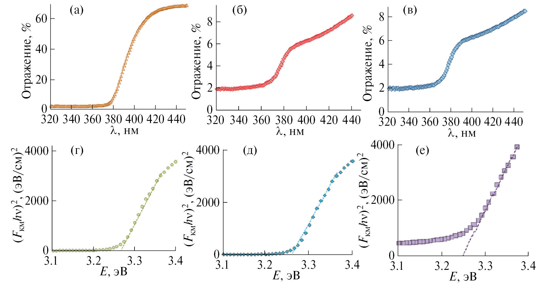 Рис. 3. Спектры диффузного отражения (а, б, в) и рассчитанные на основании их зависимости (FKM hí)2 = f(hí) для образцов Zn (а, г), ZnMn9 (б, д) и ZnMn17 (в, е).