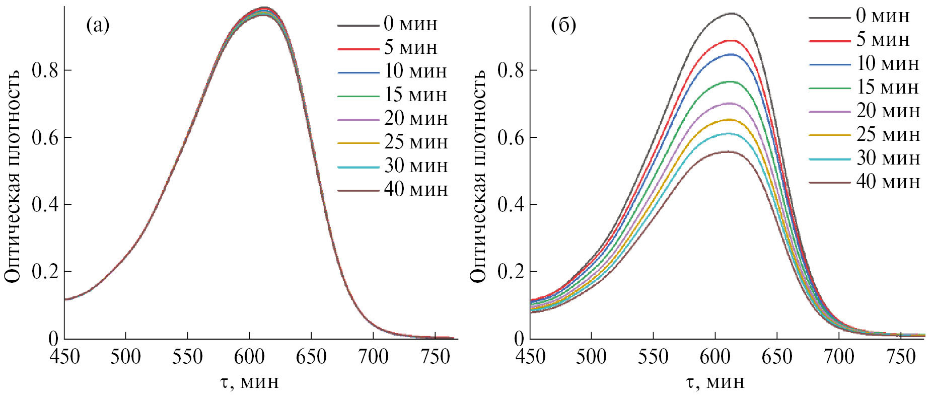 Рис. 4 иллюстрирует изменения спектров поглощения красителя в растворах в процессе их облучения синим светом (λ = 405 нм). Облучение слабо изменяет спектр поглощения раствора, не содержащего фотокатализатора (рис. 4а). Добавка композита ZnMn9 в раствор существенно ускоряет разложение красителя при облучении (рис. 4б).