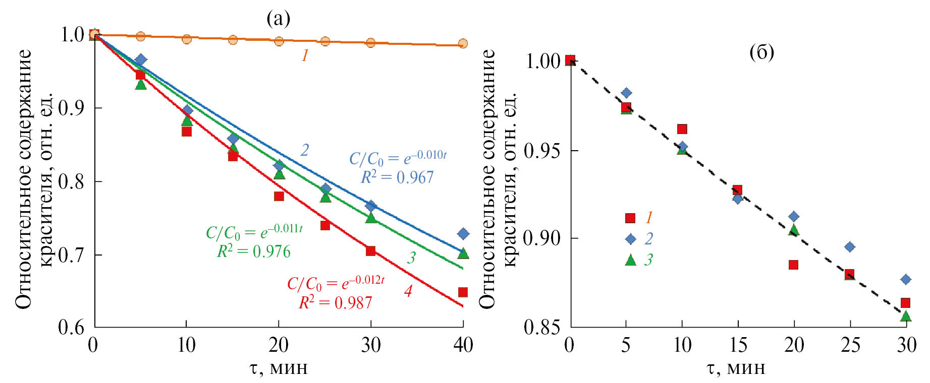 Кинетические зависимости фоторазложения красителя в растворе без добавок фотокатализаторов (кривая 1), а также в растворах, содержащих синтезированные нами композиты (кривые 2–4), показаны на рис. 5а. Из рисунка видно, что после 40 мин облучения концентрация красителя в растворах, содержащих добавки синтезированных композитов, снижается на 30–35%.
