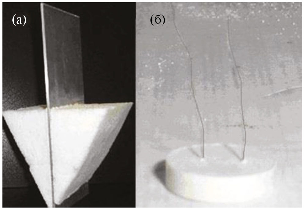 Рис. 2. Блочный КСАМ (КСКГ + золь кремниевой кислоты) с введенным теплопроводящим элементом (а) и таблетированный КСАМ (цеолит + СФ-2) с внедренной нагревательной петлей (б).