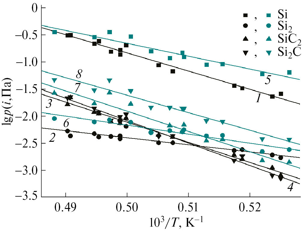 Температурные зависимости парциальных давлений молекулярных форм пара Si, Si2, SiC2 и Si2C над карбидом кремния в температурном интервале 2149–2316 K описываются следующими уравнениями: