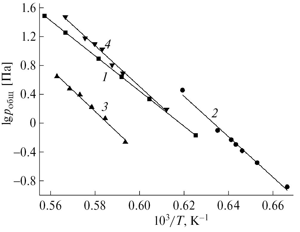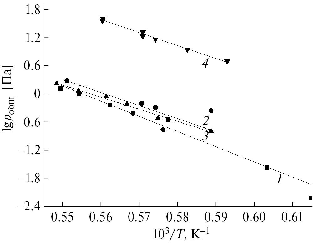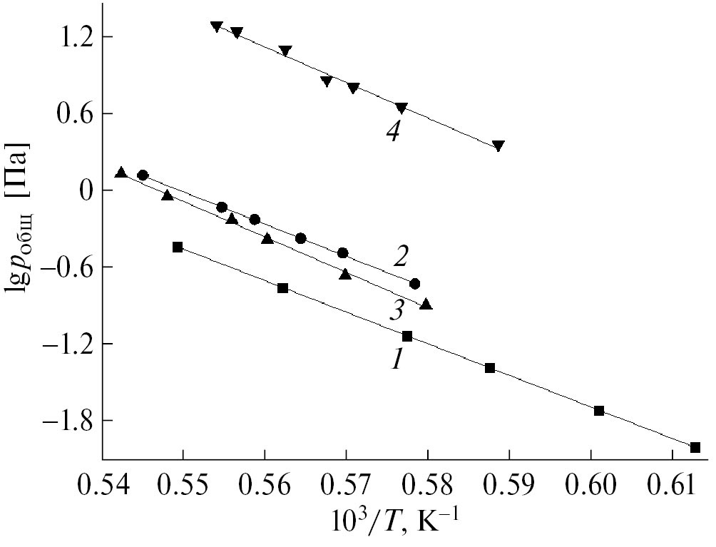 Рис. 4. Общее давление пара как сумма парциальных давлений Al и Al2O над образцами 14, 17, 20, 23 (табл. 1), содержащими, мол. %: 50Ti2AlC–50HfO2 (■, 1); 50Ti3AlC2–50HfO2 (●, 2); 50Zr2AlC–50HfO2 (▲, 3); 50Zr3AlC2–50HfO2 (▼, 4).