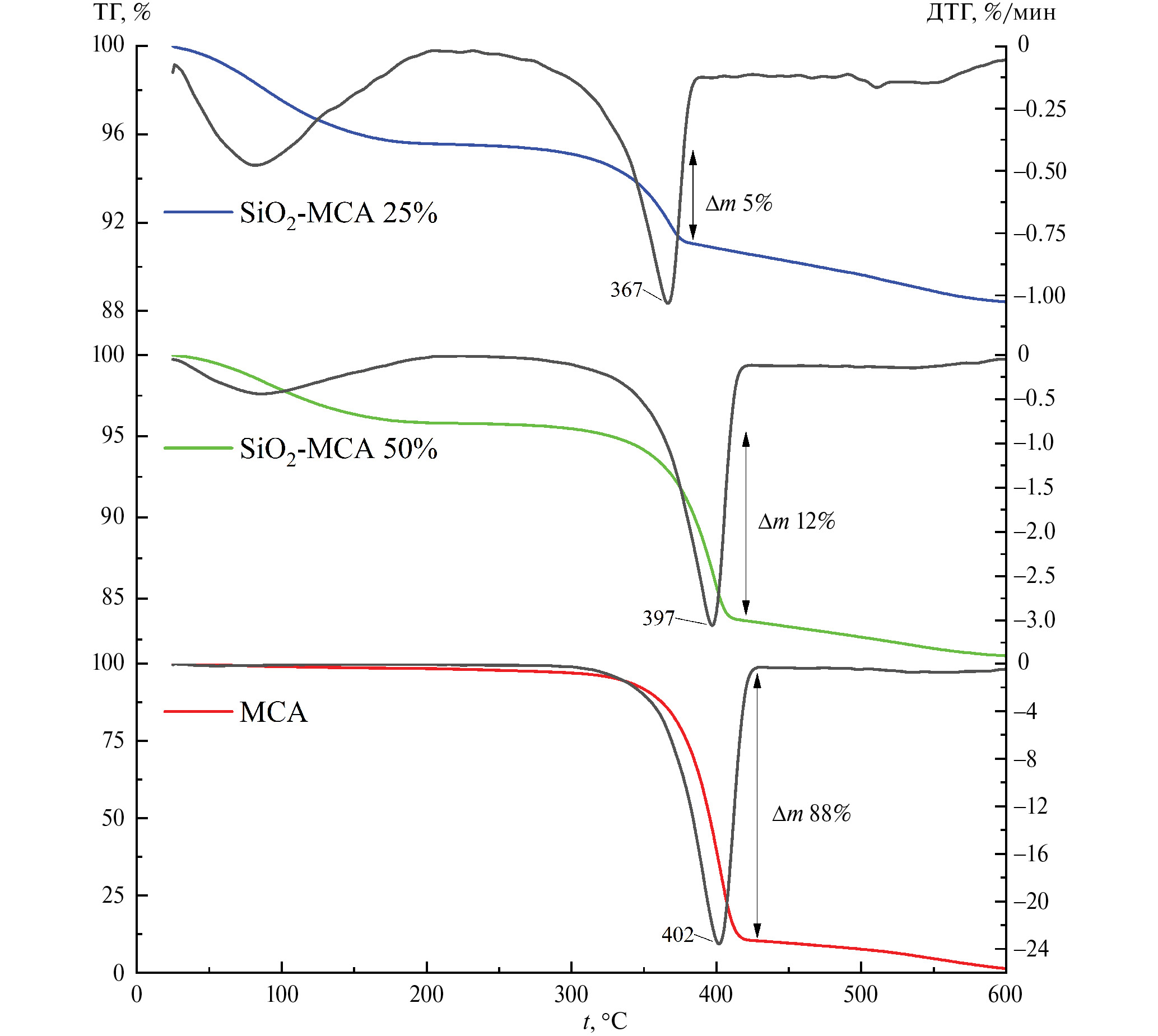 Для подтверждения этого предположения было проведено термогравиметрическое исследование образцов материала, которое показало, что температура основного пика убыли массы для SiO2-MCA 50% смещается на 5oC по отношению к чистому комплексу цианурата меламина (MCA) и составляет 397oC. В случае SiO2-MCA 25% температура убыли массы смещается на 35oC по отношению к чистому комплексу и составляет 367oC (рис. 2).
