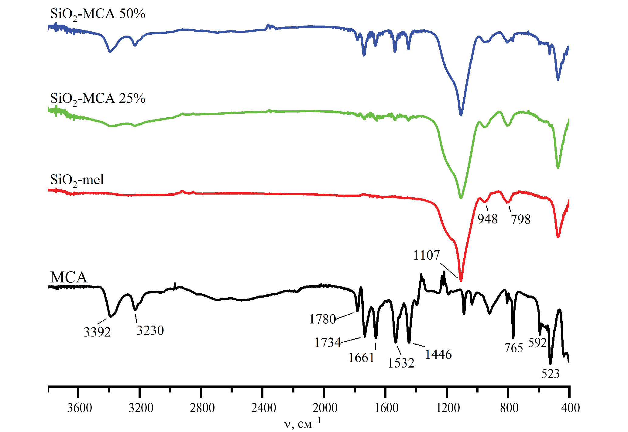 Был проведен ИК-спектральный анализ, результаты которого представлены на рис. 4. Полная расшифровка спектров цианурата меламина приведена в работе [32]. Для SiO2-mel интенсивный пик при 1107 см–1 отвечает колебаниям Si–O–Si, пики при 948 и 798 см–1 – колебаниям Si–OH и Si–O соответственно. В случае SiO2-MCA 50% пики комплекса при 3390 и 3230 см–1 хорошо выражены и могут быть отнесены к сигналам симметричных и несимметричных колебаний NH. Пики поглощения при 1780, 1733, 1661, 1532 и 1445 см–1 характеризуют колебания связи C=O циануратного комплекса меламина. Пики при 766 и 593 см–1 соответствуют колебаниям ароматического кольца, а пик при 525 см–1 – колебаниям боковых цепей ароматического кольца [32].