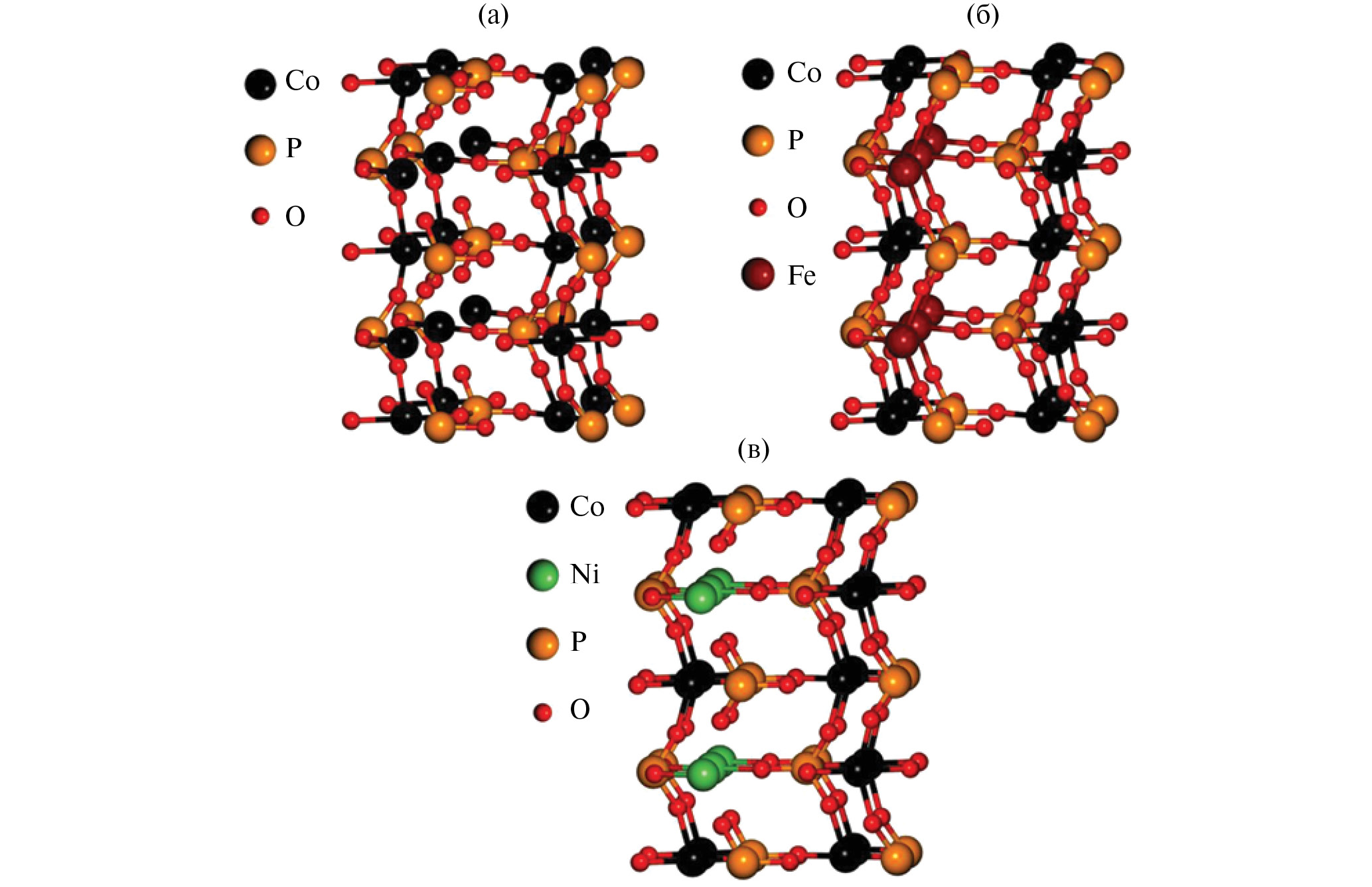 В настоящей работе были рассмотрены различные структуры фосфатов кобальта, включая моноклинную и орторомбические симметрии кристаллов. Все исследованные структуры взяты из базы данных The Materials Project [25]. Хотя на веб-сайте Materials project орторомбические структуры CoPO4 с симметрией Рna21 и Pnma обозначены как экспериментально не обнаруженные, тем не менее в работах [22, 26] были исследованы структуры CoPO4 c симметрией Рna21 и Pnma, легированные атомами лития. На рис. 1а–1в показана геометрия как чистого кобальт фосфата, так и Fe- или Ni-легированного кобальт фосфата. Кристаллическая структура CoPO4 описывается элементарной ячейкой, принадлежащей орторомбической симметрии Рna2₁ и содержит 24 базисных атома. Постоянные решетки для исследованных систем приведены в табл. 1. Атомы Co в структуре CoPO4 шестикратно координированы атомами O, причем таким образом, что имеются три ближайших атома O на расстоянии 1.85 Å и три следующих за ближайшими атомами O на расстоянии 1.98 Å, при этом атомы P имеют тетраэдрическую координацию. Моделирование легированного CoPO4 производили путем замещения одного из атомов кобальта атомами никеля и железа суперячейки типа 2 × 1 × 1, состоящей из 48 атомов, полученной двукратной трансляцией элементарной ячейки CoPO4 вдоль x-вектора трансляции. В расчетах использовали кристаллические структуры Co8(PO4)8, Co7Fe(PO4)8, и Co7Ni(PO4)8, которые соответствуют ⁓5%-ному допированию чистого Co8(PO4)8 атомами железа и никеля (рис. 1).