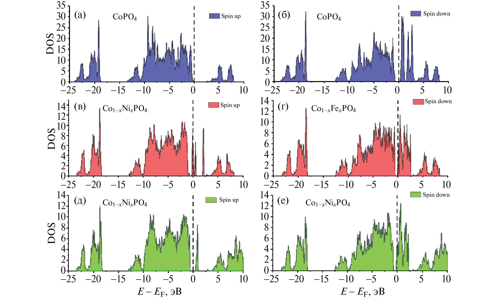 Рис. 2. Плотность электронных состояний (DOS) со спином вверх и вниз для чистого CoPO4 (а, б), а также CoPO4, легированного железом (в, г) и никелем (д, е). Нулевая энергия берется на уровне Ферми, левая половина рисунков отображает состояние со спином вверх, а правая – состояние со спином вниз.