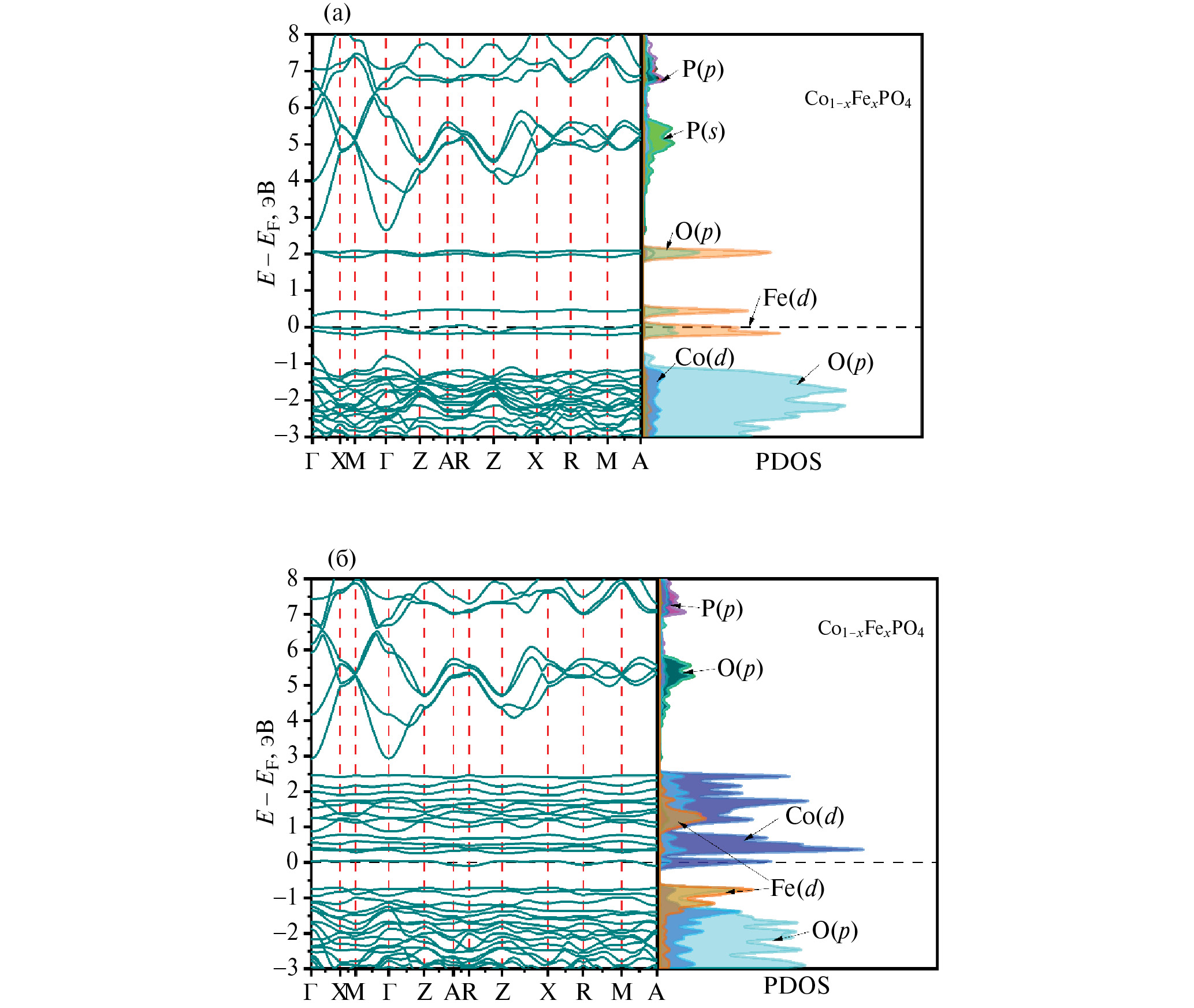 Рис. 4. Структура энергетических зон и парциальные плотности состояний системы Co1–xFexPO4 для электронов со спинами вверх (а) и для электронов со спинами вниз (б).