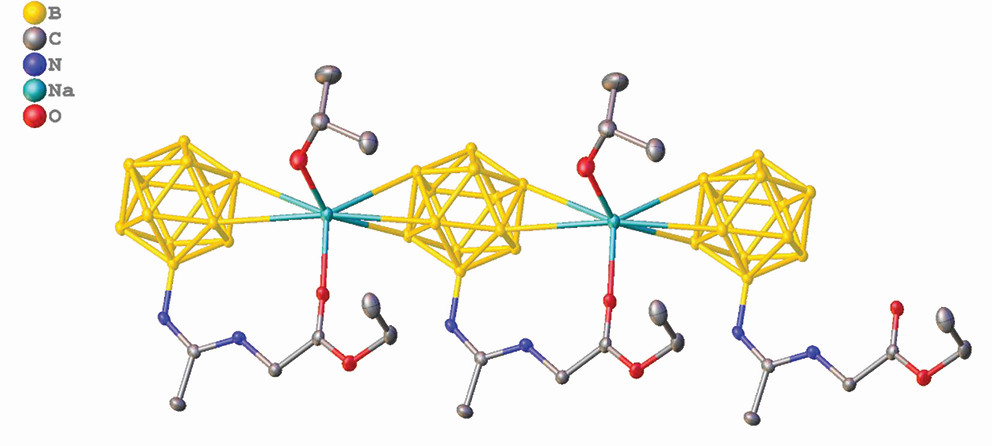Изопропиловый спирт сольватирует ион натрия, образуя устойчивую жесткую структуру. В окружение каждого атома натрия входит молекула спирта, карбонильный атом кислорода экзополиэдрического заместителя, одна грань и одно ребро двух соседних кластерных анионов бора. В результате образуется квази-1D-полимерная цепь за счет кулоновского взаимодействия между ионом натрия и борилированным амидином.