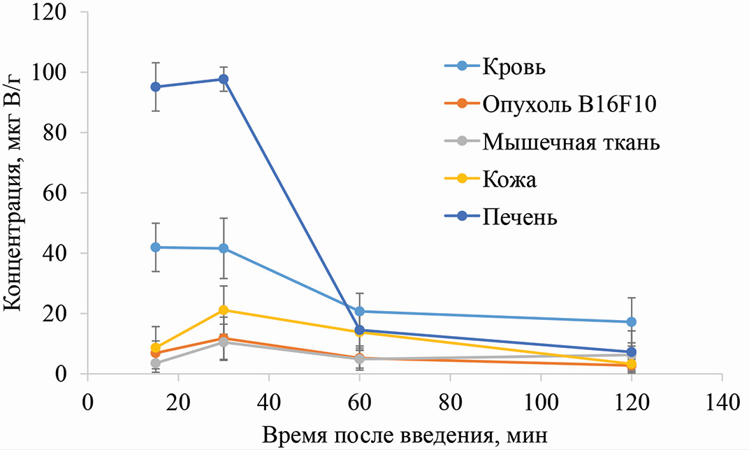 Исследование фармакокинетических свойств проводили на самках мышей линии C57Bl/6 весом 20–22 г (разведение ФГБУ “НМИЦ онкологии им. Н.Н. Блохина” Минздрава России). В качестве опухолевой модели использовали штамм опухолевых клеток линии меланомы B16F10 [37]. Биоматериал получен из криохранилища опухолевых культур ФГБУ “НМИЦ онкологии им. Н.Н. Блохина” Минздрава России. Опухолевую взвесь готовили ex tempore из опухолевых узлов второго пассажа. Опухолевый узел объемом 0.6–1 см3 удаляли из тела животного с помощью медицинских ножниц. Затем опухолевый узел гомогенизировали и добавляли раствор Хэнкса в соотношении 1 : 6 (опухоль : раствор) по массе. Инокулят перевивали подкожно в правую заднюю лапу в объеме 0.2 мл. Исследование проводили, когда объем опухолевого узла достигал 0.3–0.4 см3. Для исследования фармакокинетических свойств изучаемого соединения животные были разделены на четыре группы по три мыши. Каждая группа соответствовала временным точкам в 15, 30, 60 и 120 мин соответственно. Животным вводили внутрибрюшинно 0.3 мл раствора исследуемого соединения (для его приготовления использовали воду для инъекций) с концентрацией 10 мг/мл, что соответствовало 3.7 (мг B)/мл. Через соответствующие интервалы времени животных подвергали эвтаназии и извлекали следующие органы и ткани: кровь, опухолевый узел, мышечную ткань, кожу (очищенную от шерсти) и печень. После извлечения все органы и ткани помещали в пластиковые контейнеры, не содержащие бор, и взвешивали. Образцы в контейнерах помещали на хранение в морозильную камеру с температурой –20°C.