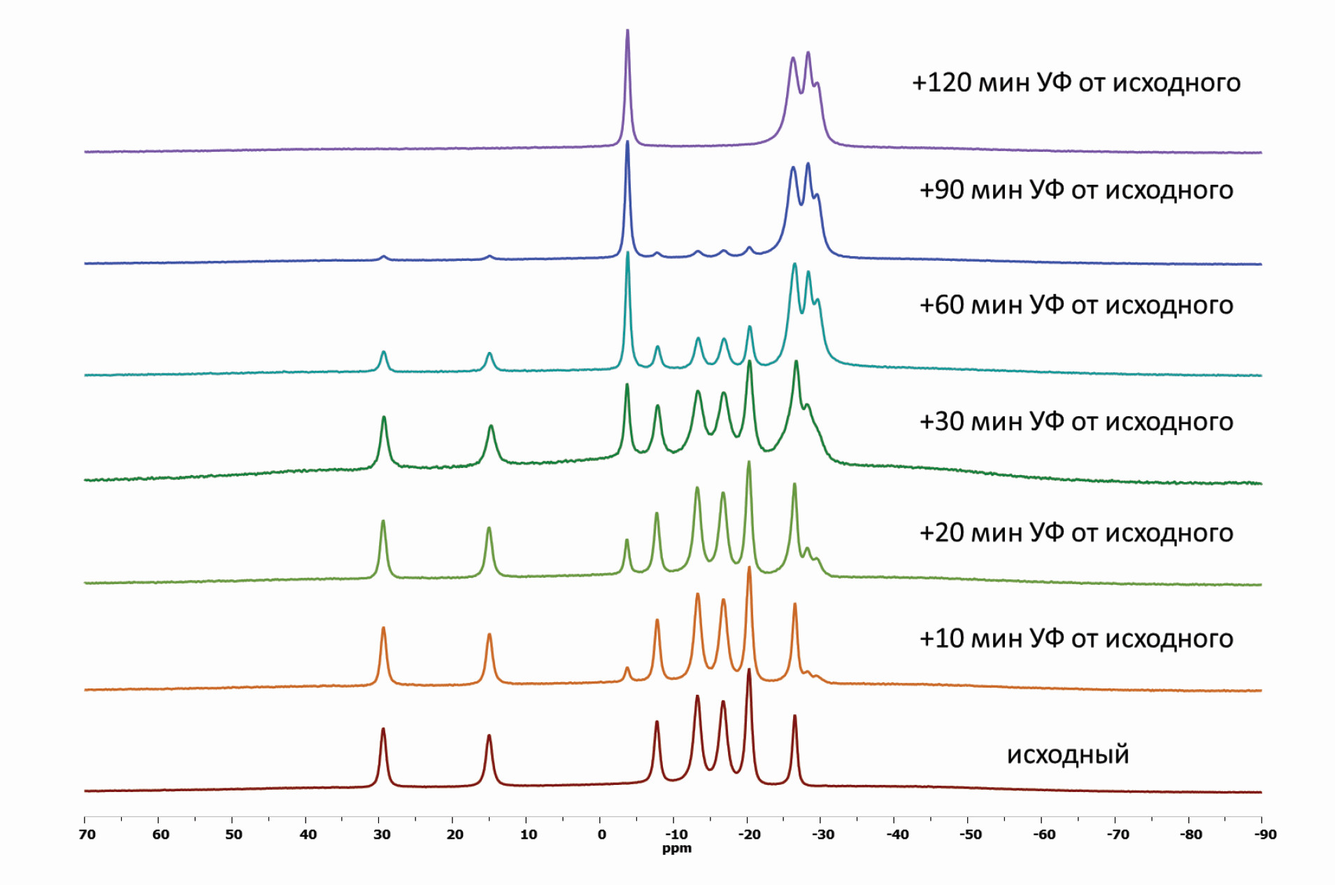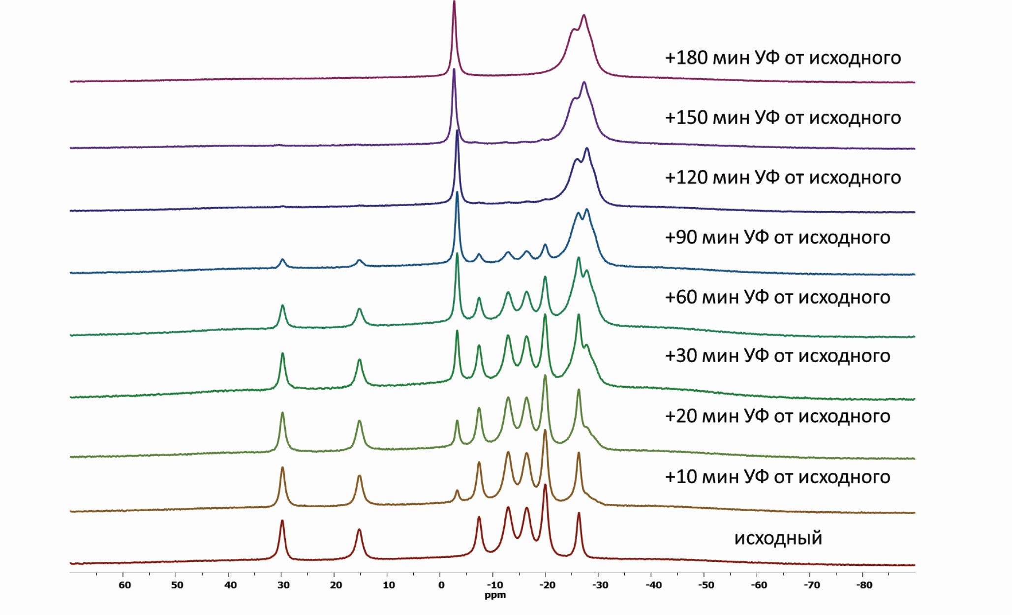 УФ-эксперименты. Исследование времени протекания процесса перегруппировки аниона [транс-B20H18]2– → [изо-B20H18]2– под действием УФ-облучения проводили с помощью 11В ЯМР-спектроскопии с использованием кварцевой ампулы Wilmad 507-TR-7 (диаметр 5 мм, толщина 0.38 мм) с интервалом времени: 0, 10, 20, 30, 60, 90, 120, 180 мин. В качестве источника УФ-излучения использовали лампу Camelion LH 26-FS/BLB/E27 (мощность 26 Вт, длина волны 365 нм), помещенную в обернутую фольгой емкость с ЯМР-ампулой. В качестве исследуемых образцов использовали соль (Ph4P)2[B20H18] (15 мг) в 0.5 мл соответствующего растворителя (CH3CN, ДМФА или ДМСО).