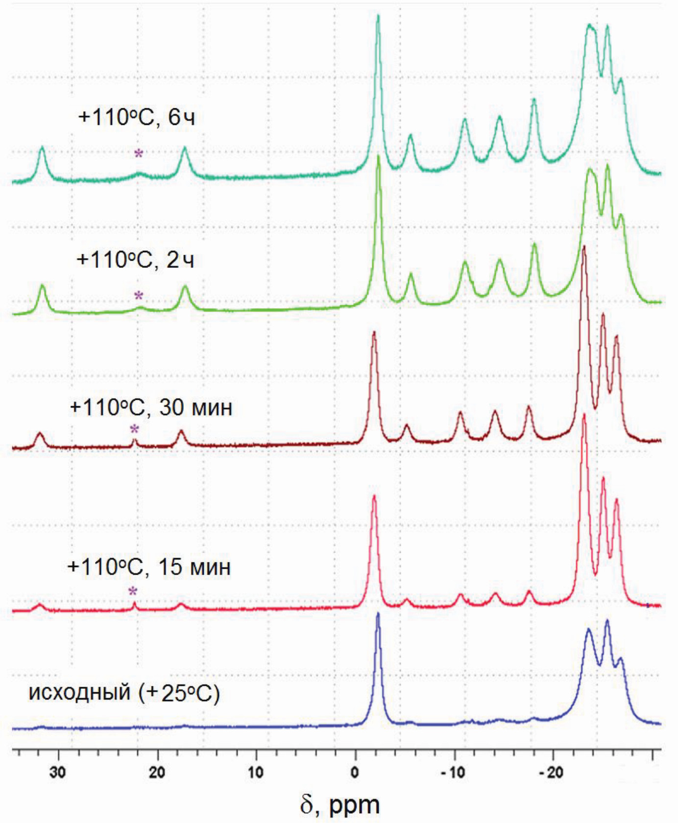 Как и в случае проведения реакции в CH3CN, что было обнаружено Хоторном [2], с течением времени в 11В ЯМР-спектрах раствора соли (Ph4P)2 [изо-B20H18] в ДМФА происходит возникновение и увеличение интенсивности сигналов от [транс-B20H18]2– одновременно с уменьшением интенсивности сигналов от [изо-B20H18]2– (рис. 5). Через 6 ч нагревания ампулы при 110°С конверсия аниона [изо-B20H18]2– составляет ⁓50%. При этом видно, что с увеличением времени выдерживания раствора [изо-B20H18]2– в ДМФА при высокой температуре в 11В ЯМР-спектре одновременно с увеличением интенсивности сигналов от аниона [транс-B20H18]2– происходит возникновение и увеличение интенсивности синглета при ⁓22 м.д., что свидетельствует об образовании продуктов окисления бороводородного кластера, которые подробно описаны в [35, 36].