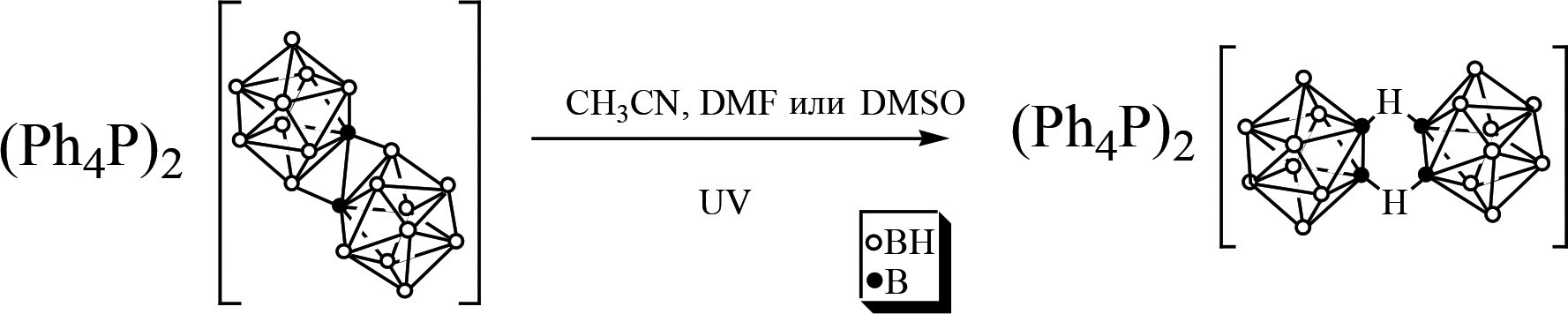 В ходе настоящего исследования изучена перегруппировка Хоторна [транс-B20H18]2– → [изо-B20H18]2– под действием УФ-излучения в различных растворителях (ацетонитриле, ДМФА, ДМСО) и показано, что время протекания реакции зависит от используемого растворителя. Нагревание солей аниона [изо-B20H18]2– в ДМФА позволяет провести обратную реакцию с образованием [транс-B20H18]2–, однако этот процесс сопровождается окислением борного кластера.