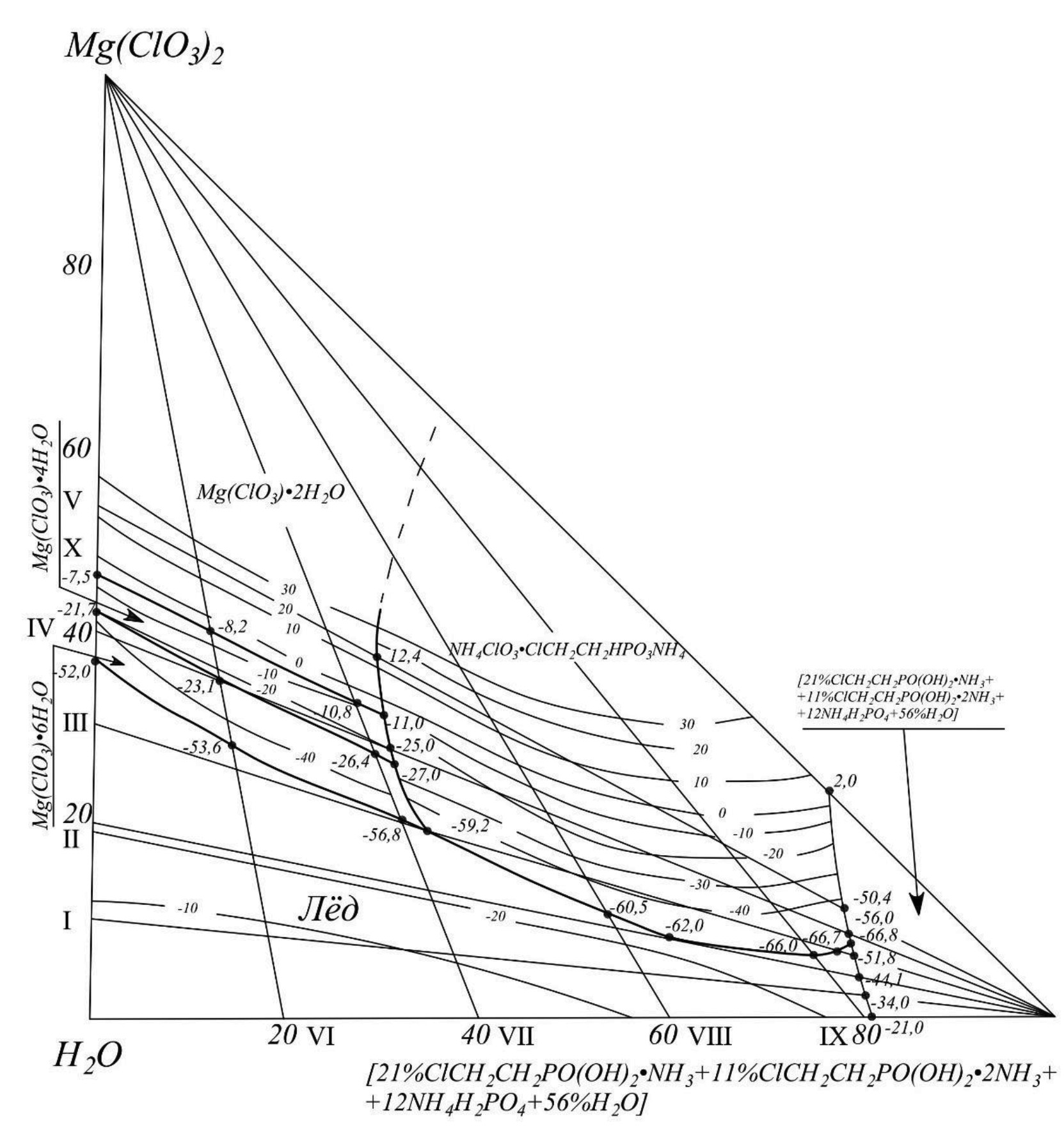 10.4 | 53.3 | 36.3 | –60.5 | Лед + NH4ClO3 · ClCH2CH2HPO3NH4 |