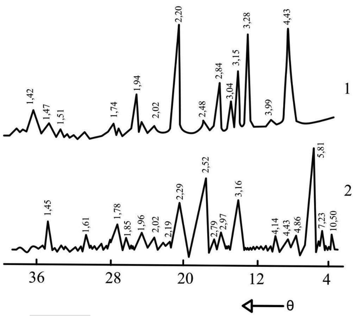Рис. 2. Рентгенограмма NH4ClO3 (1) и NH4ClO3 · · ClCH2CH2HPO3NH4 (2).