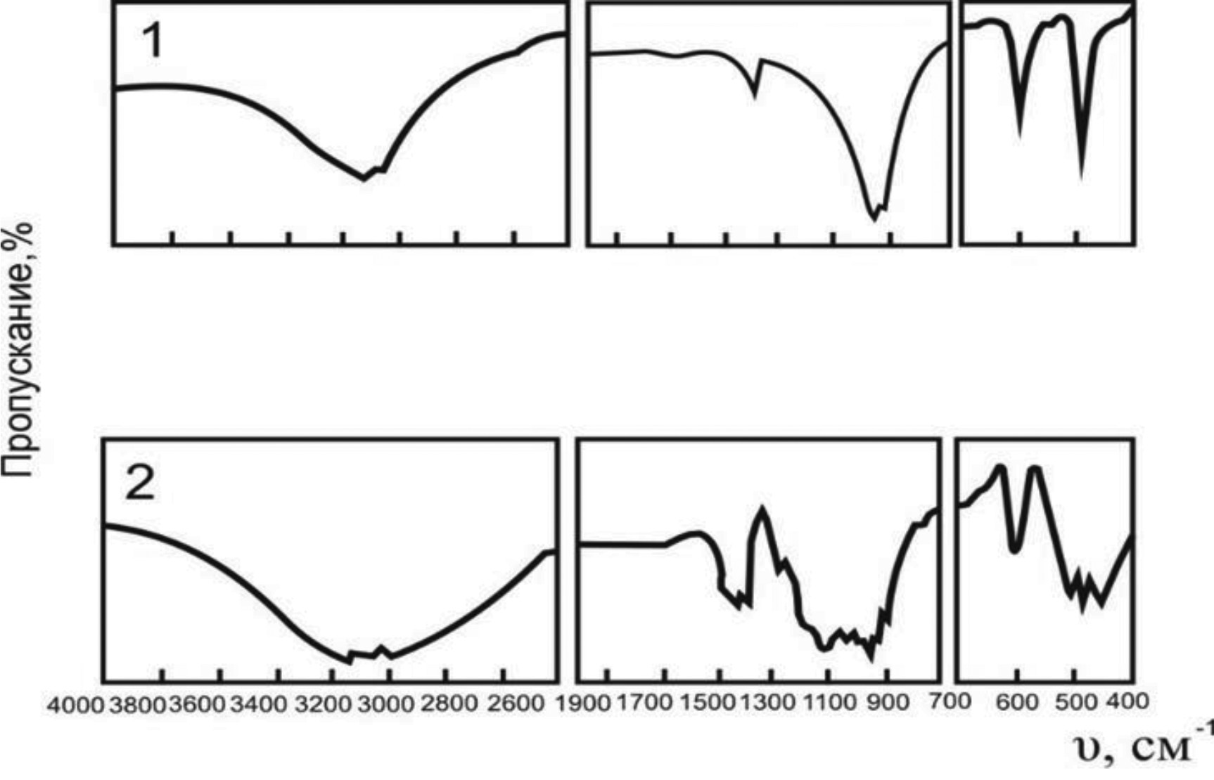 Рис. 4. ИК-спектры: NH4ClO3 (1), NH4ClO3 · · ClCH2CH2HPO3NH4 (2).