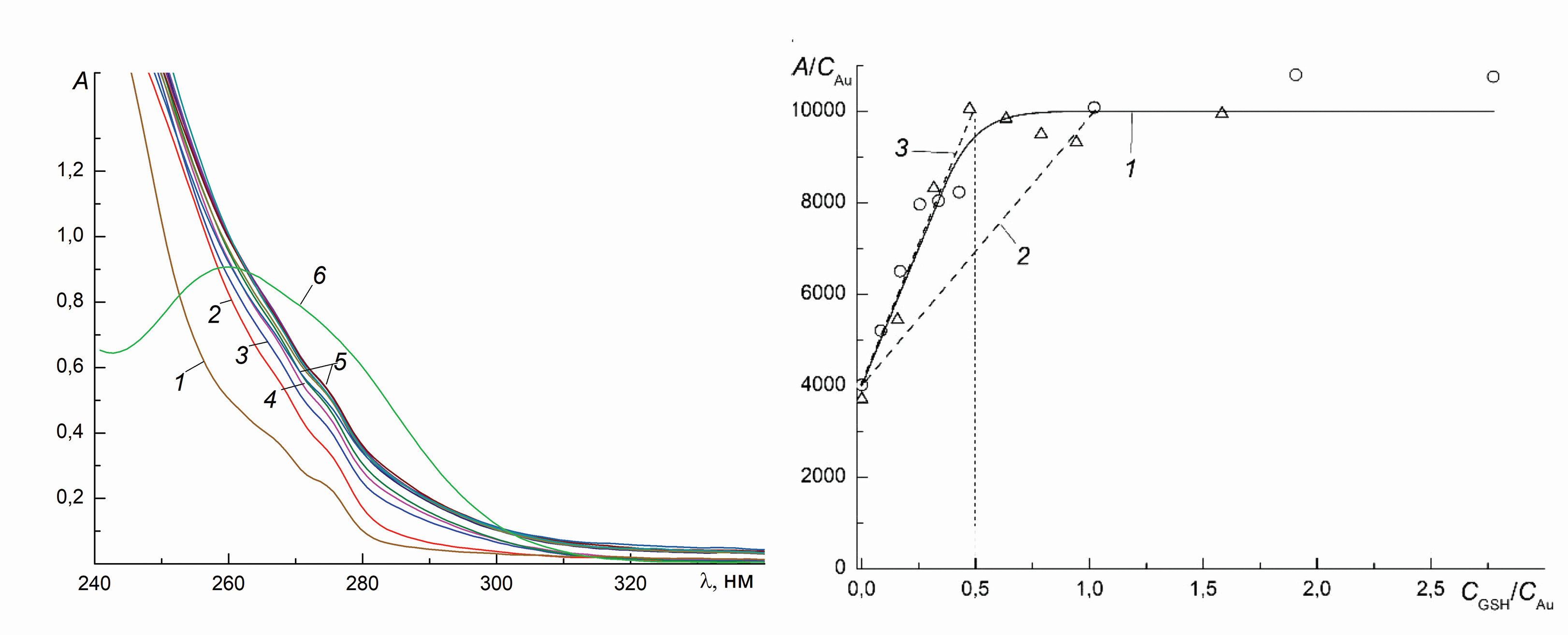 Аналогичные изменения УФ-спектров наблюдались при использовании цистеина (Cys) (рис. 2). На начальном этапе Cl– замещается на Cys с образованием биядерного Cys[Au(PPh3)]2, а затем моноядерного Au(Cys)(PPh3) комплексов. Следов белого осадка AuHCysтв не наблюдалось, т.е. замещения фосфина на Cys не происходит, в том числе при CCys/CAu = 20.