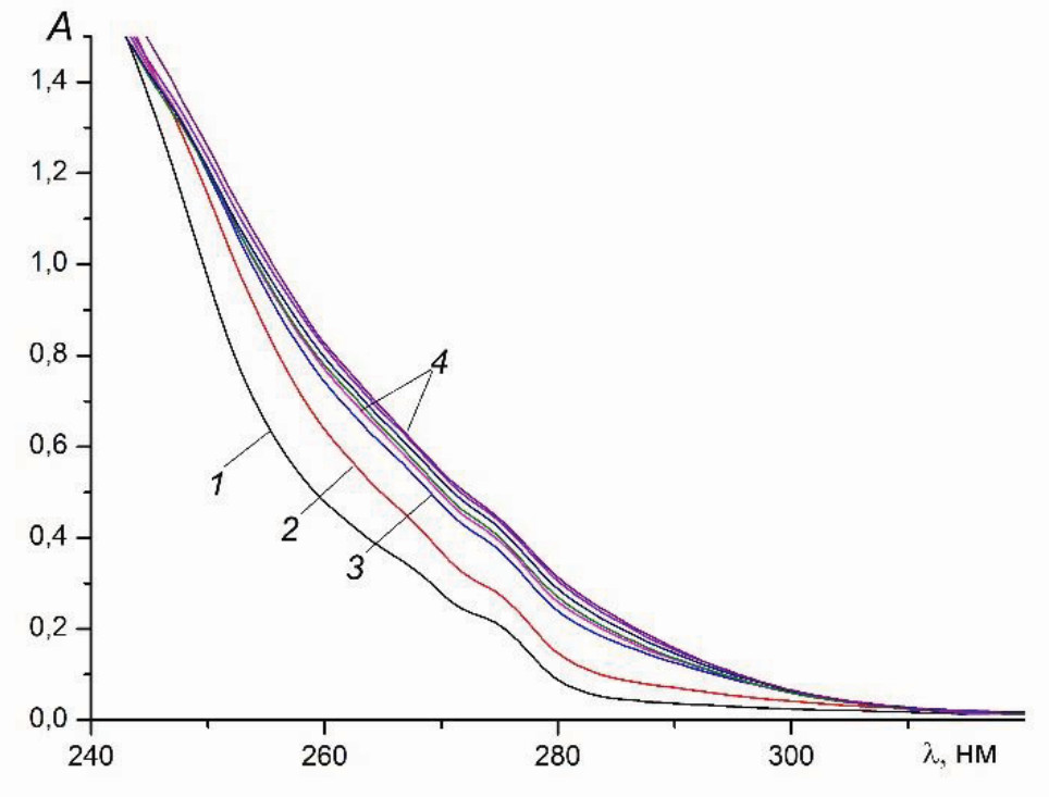 Рис. 2. Изменение УФ-спектра раствора при взаимодействии AuCl(PPh3) с цистеином. CAu = 1.34 × 10–4 M, CCys (10–4 M): 0 (1); 0.35 (2); 0.67 (3); 1.0–12 (4). pH 7.4, 50%-ный AN, l = 1 см.