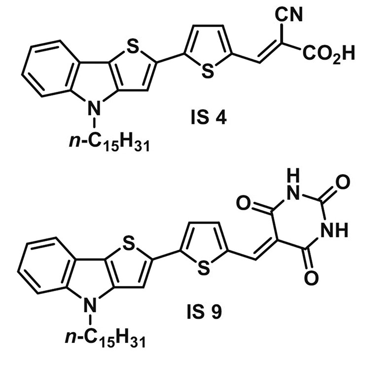 Адсорбция красителей на поверхность наностержней ZnO. Адсорбцию ранее синтезированных красителей на основе тиено[3, 2-b]индола со структурой D-π-A [28], содержащих в качестве донорной части фрагмент тиено[3, 2-b]индола и фрагмент 2-цианоакриловой кислоты IS 4 или 5-(метилен)барбитуровой кислоты IS 9 в качестве акцепторно-якорной части, на поверхность наностержней ZnO осуществляли из раствора в хлороформе с концентрацией 5 × 10–4 М выдерживанием фотоанода (активная площадь 0.36 см2) в течение 24 ч. Структурные формулы красителей представлены на рис. 1.