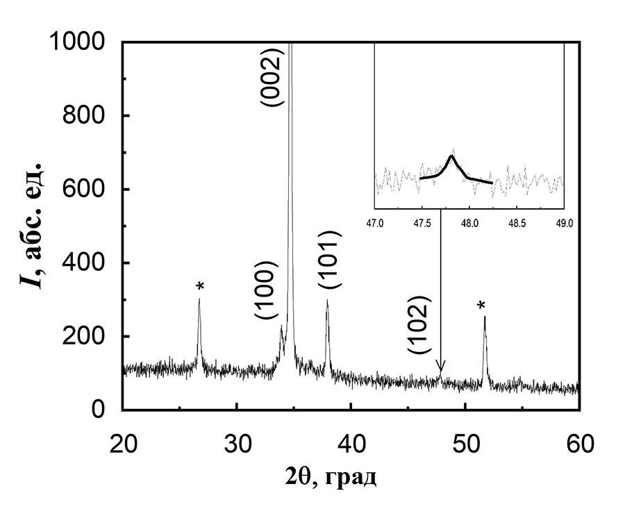 Рис 2. Рентгеновская дифрактограмма массивов наностержней ZnO на стеклянной подложке со слоем FTO. Звездочкой обозначены рефлексы, соответствующие проводящему слою FTO.