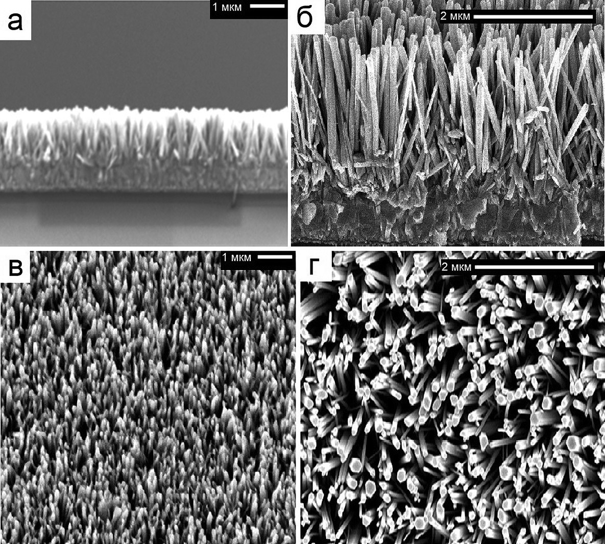 С помощью сканирующей электронной микроскопии (СЭМ) была исследована морфология одномерных наностержней ZnO с различным временем роста. Установлено, что выращенные массивы наностержней преимущественно ориентированы перпендикулярно относительно поверхности подложки, имеют высокую плотность по площади и равномерно распределены на проводящей стеклянной подложке. На рис. 3 показаны наностержни ZnO, время роста которых составило 30 и 120 мин. Массив с меньшим временем роста имеет среднюю высоту 1.3 мкм (рис. 3a) и средний диаметр 100 нм (рис. 3в). При увеличении времени роста до 120 мин происходит увеличение средней высоты наностержней до 2.5 мкм (рис. 3б), но при этом их средний диаметр не меняется. Наностержни имеют шестиугольную форму на верхней грани в направлении (100), что хорошо видно на рис. 3г. Полученные снимки согласуются с литературными данными [35, 36].