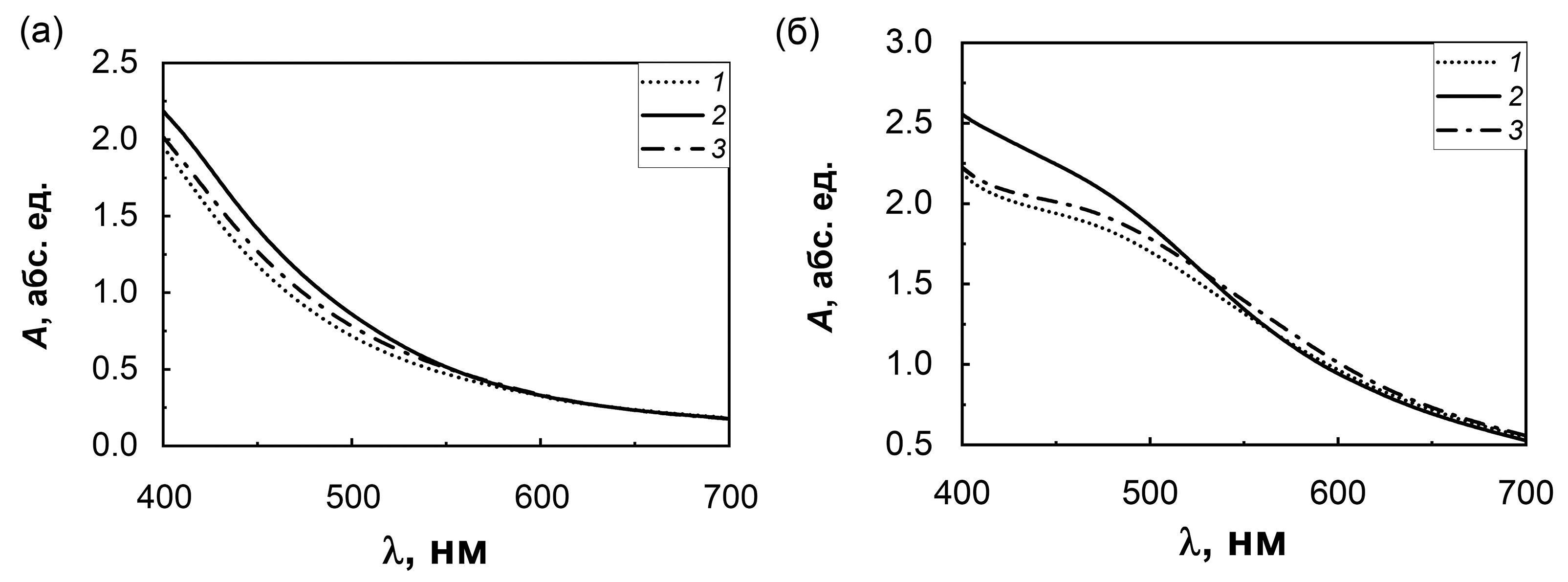 Рис. 5. Спектры поглощения наностержней ZnO, полученных в течение 30 (a) и 120 мин (б) без красителей и с красителями IS 4, IS 9, адсорбированными на поверхности ZnO: 1 – ZnO; 2 – IS 4 на ZnO; 3 – IS 9 на ZnO.